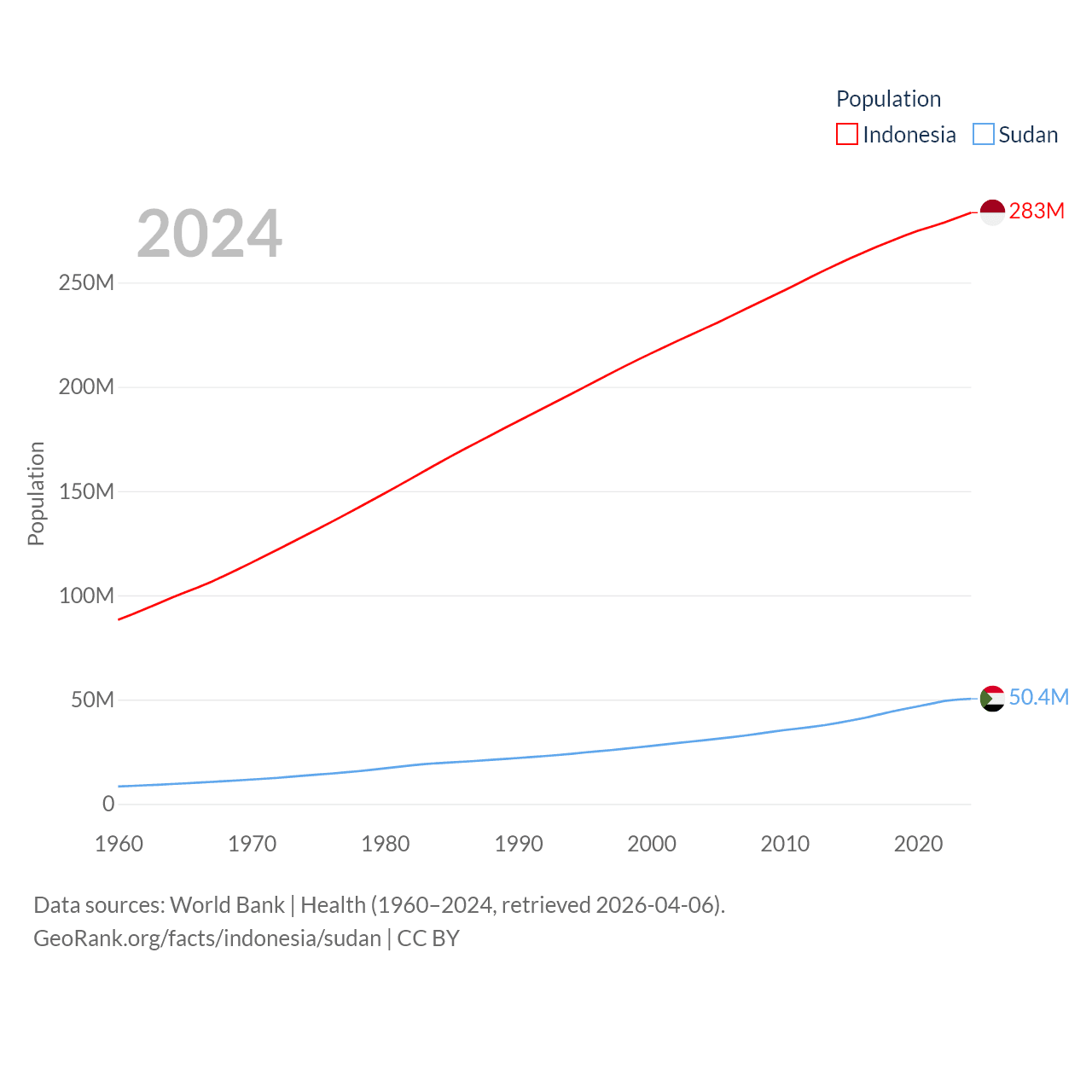 Indonesia has a population of 283M (ranked 4/197), compared with 50.4M in Sudan (ranked 30/197). Indonesia's land area is 730,720 sq mi versus 721,239 sq mi for Sudan (ranked 14th vs. 15th).