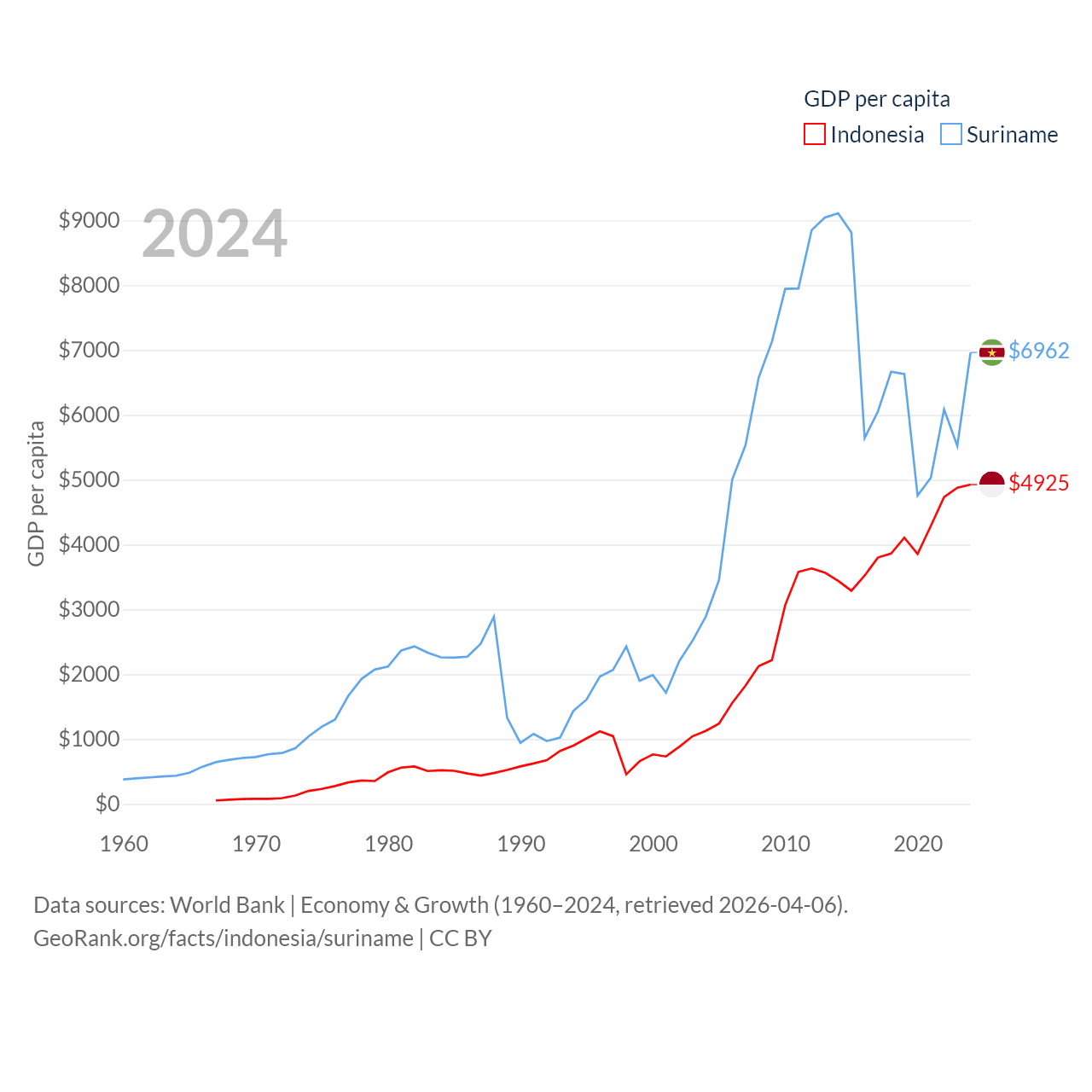 By GDP, Indonesia ranks 16/197 ($1.4T) and Suriname ranks 164/197 ($4.42B). By GDP per capita, Indonesia ranks 121/197 ($4,925), while Suriname ranks 102/197 ($6,962).