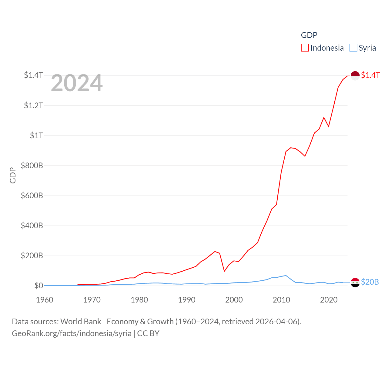 By GDP, Indonesia ranks 16/197 ($1.4T) and Syria ranks 129/197 ($20B). By GDP per capita, Indonesia ranks 121/197 ($4,925), while Syria ranks 185/197 ($847).