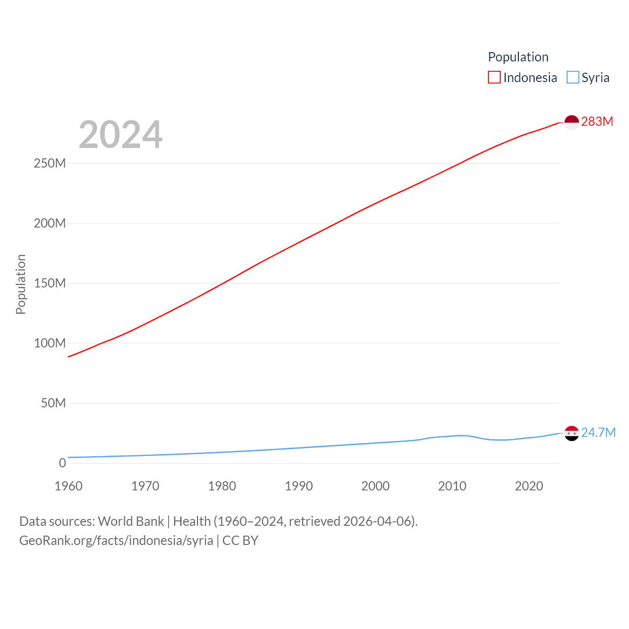 Indonesia has a population of 283M (ranked 4/197), compared with 24.7M in Syria (ranked 57/197). Indonesia's land area is 730,720 sq mi versus 70,900 sq mi for Syria (ranked 14th vs. 87th).