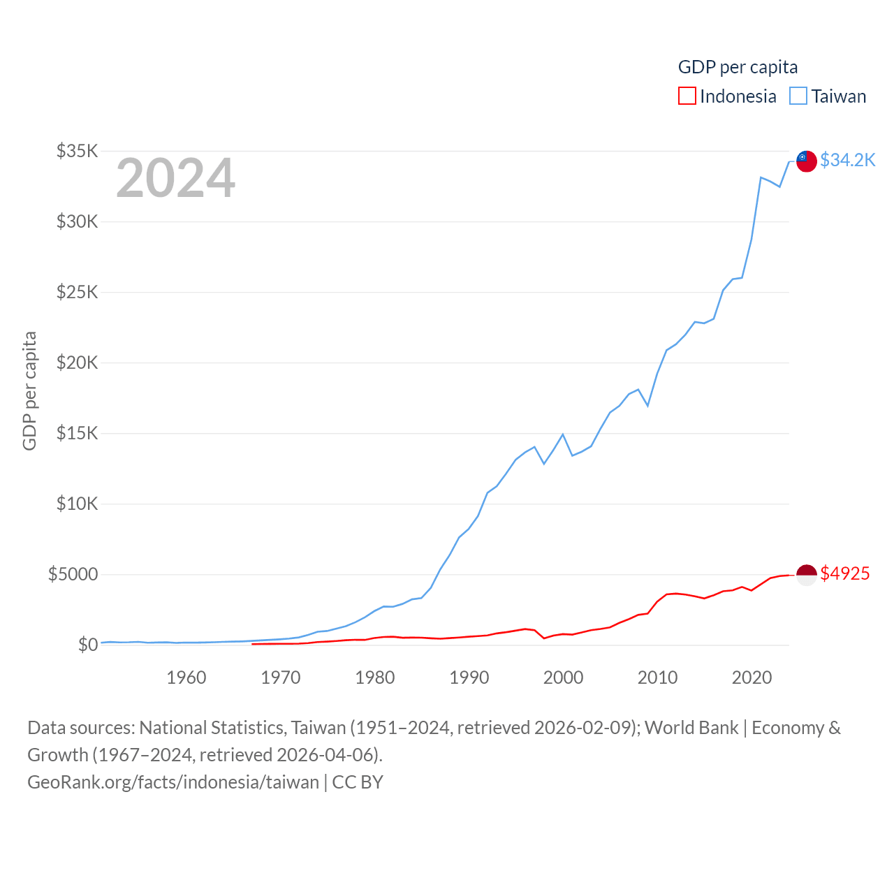 By GDP, Indonesia ranks 16/197 ($1.4T) and Taiwan ranks 22/197 ($802B). By GDP per capita, Indonesia ranks 121/197 ($4,925), while Taiwan ranks 35/197 ($34,238).
