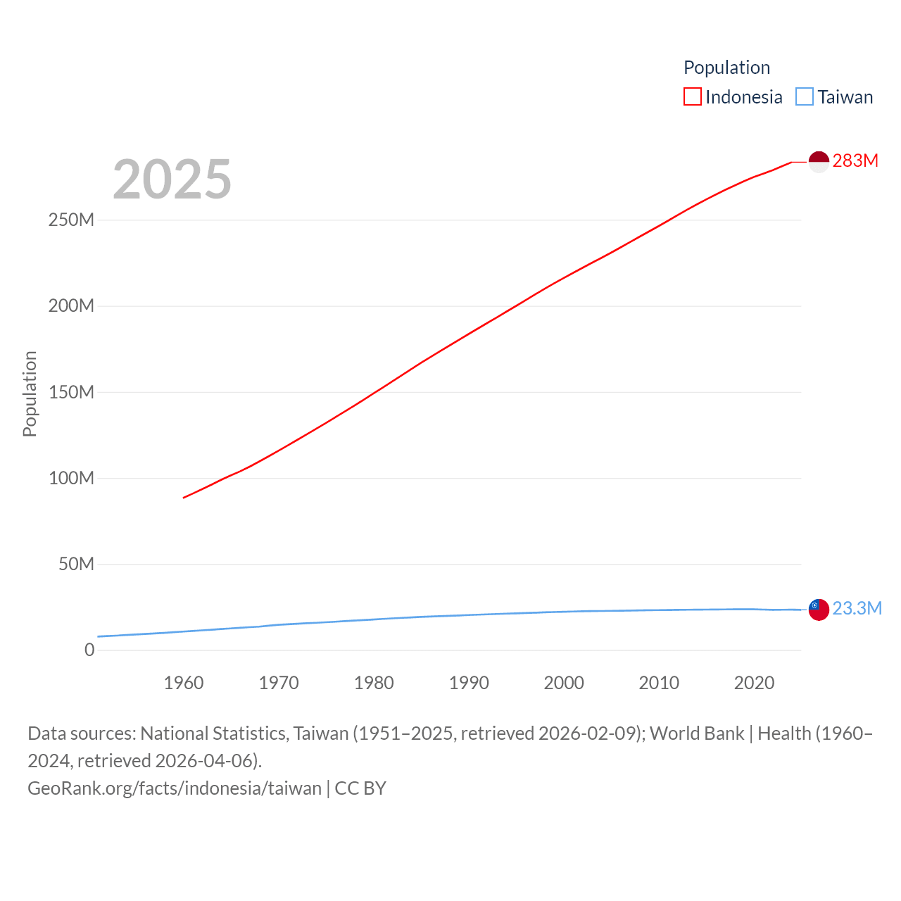 Indonesia has a population of 283M (ranked 4/197), compared with 23.3M in Taiwan (ranked 60/197). Indonesia's land area is 730,720 sq mi versus 13,976 sq mi for Taiwan (ranked 14th vs. 133rd).