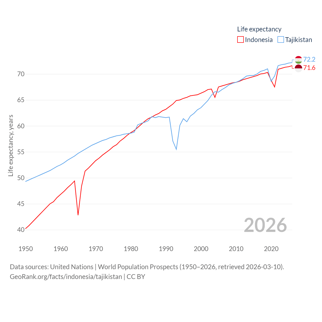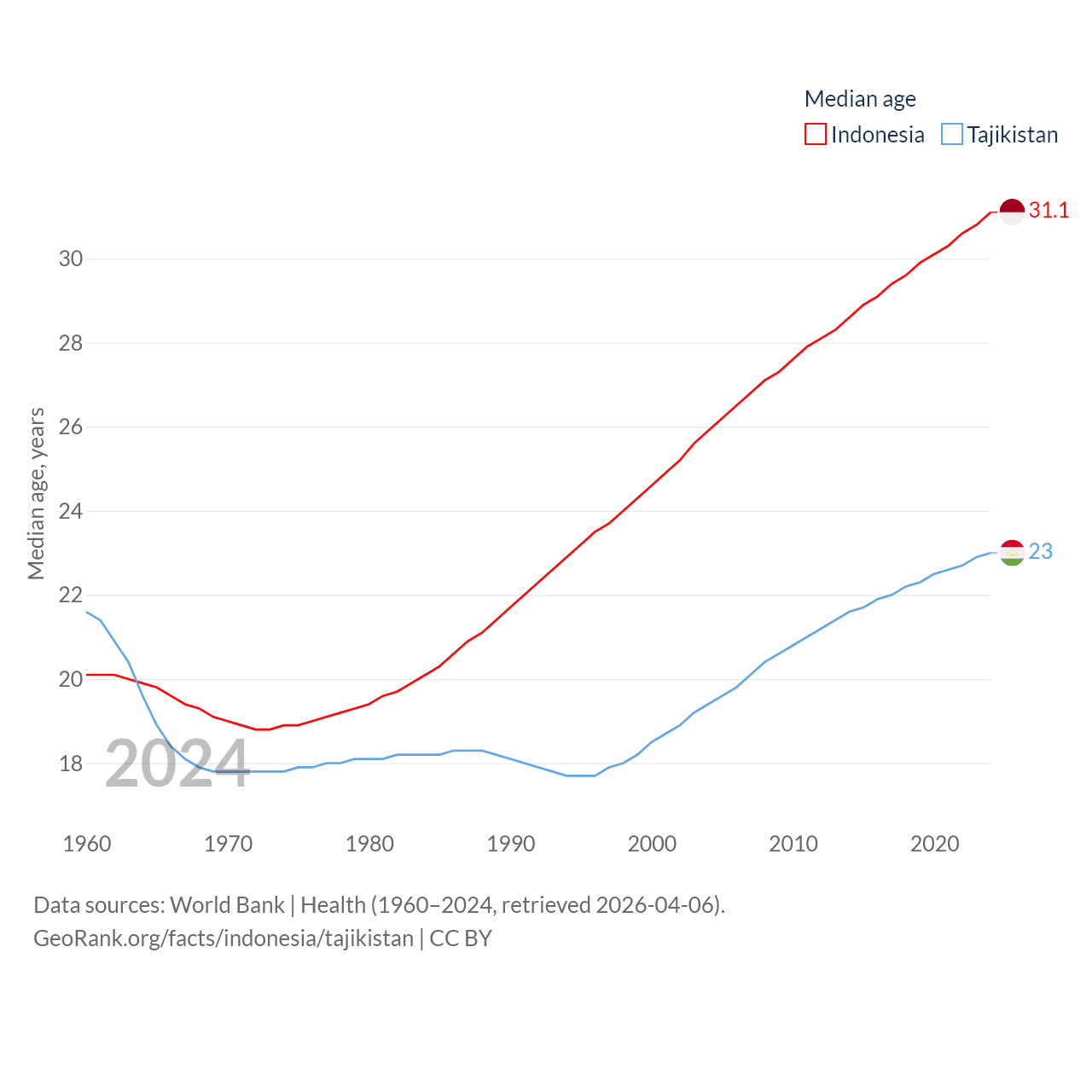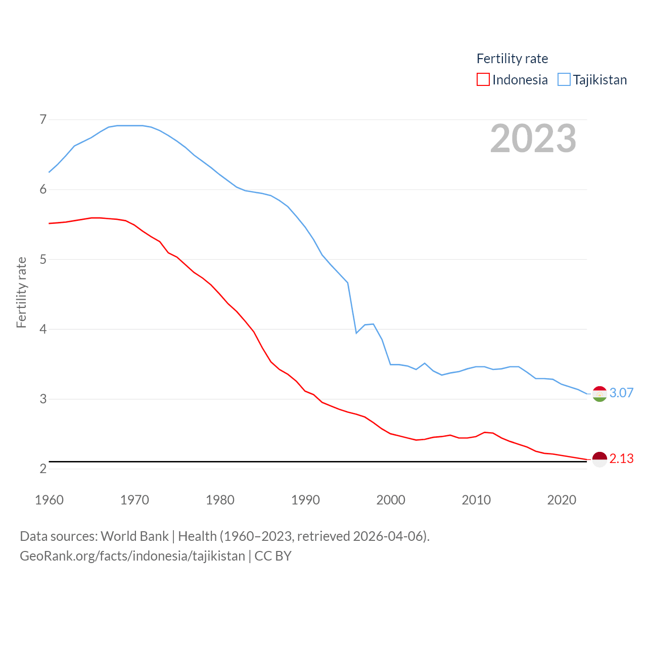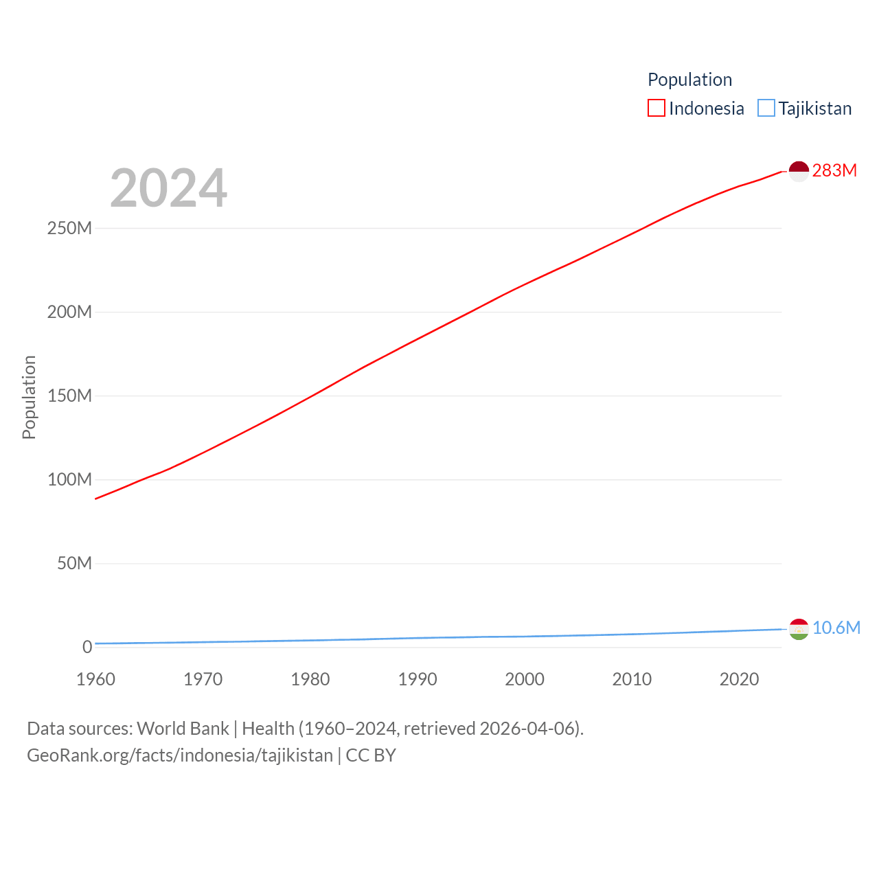 Indonesia has a population of 283M (ranked 4/197), compared with 10.6M in Tajikistan (ranked 91/197). Indonesia's land area is 730,720 sq mi versus 53,587 sq mi for Tajikistan (ranked 14th vs. 93rd).