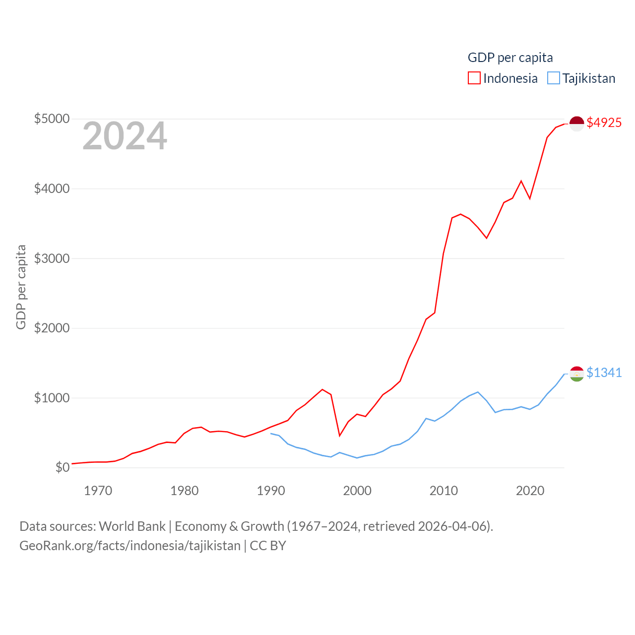 By GDP, Indonesia ranks 16/197 ($1.4T) and Tajikistan ranks 145/197 ($14.2B). By GDP per capita, Indonesia ranks 121/197 ($4,925), while Tajikistan ranks 166/197 ($1,341).