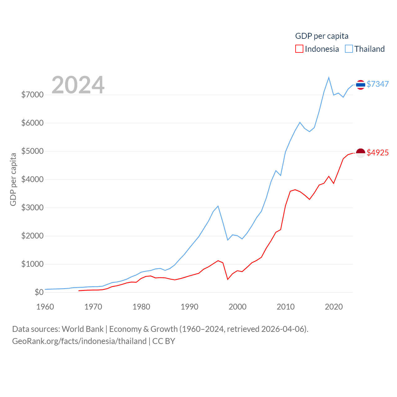 By GDP, Indonesia ranks 16/197 ($1.4T) and Thailand ranks 31/197 ($527B). By GDP per capita, Indonesia ranks 121/197 ($4,925), while Thailand ranks 100/197 ($7,347).