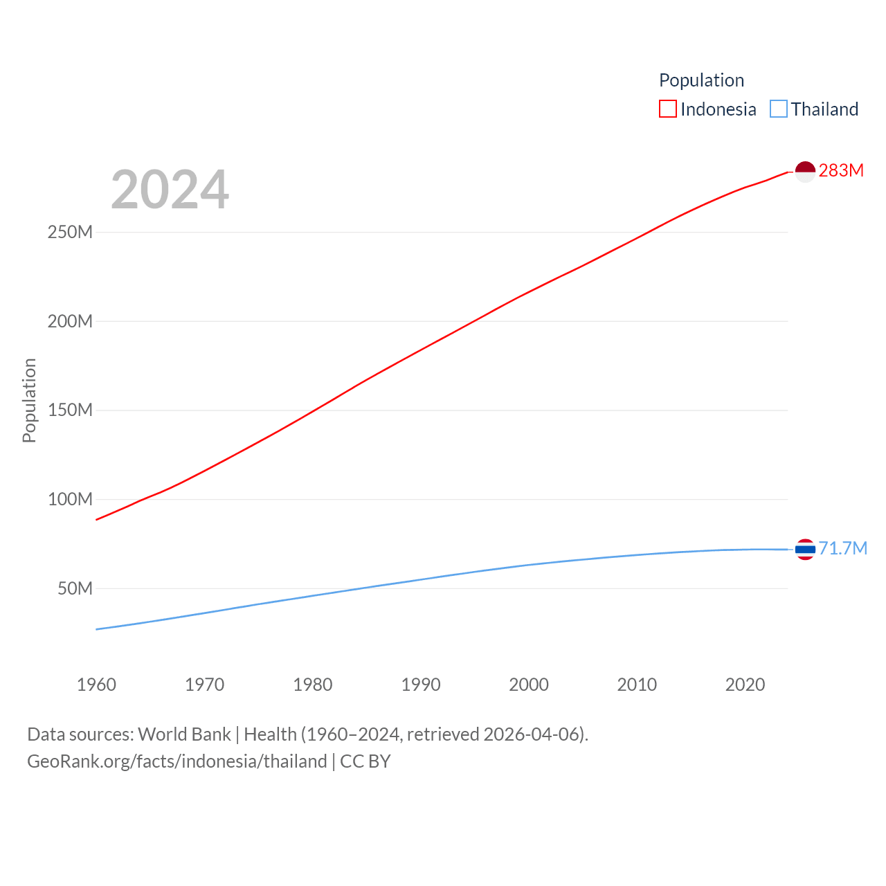 Indonesia has a population of 283M (ranked 4/197), compared with 71.7M in Thailand (ranked 20/197). Indonesia's land area is 730,720 sq mi versus 197,256 sq mi for Thailand (ranked 14th vs. 50th).