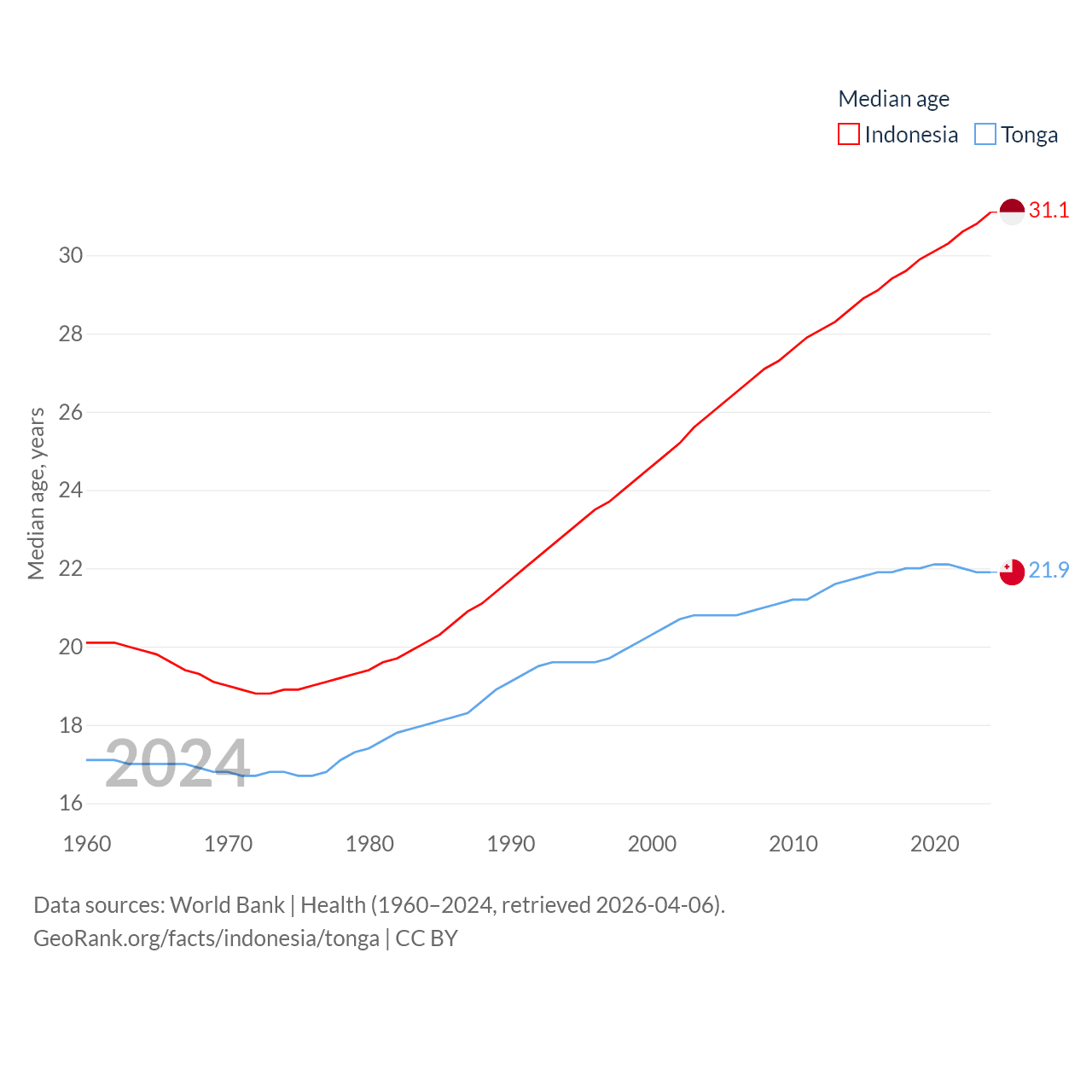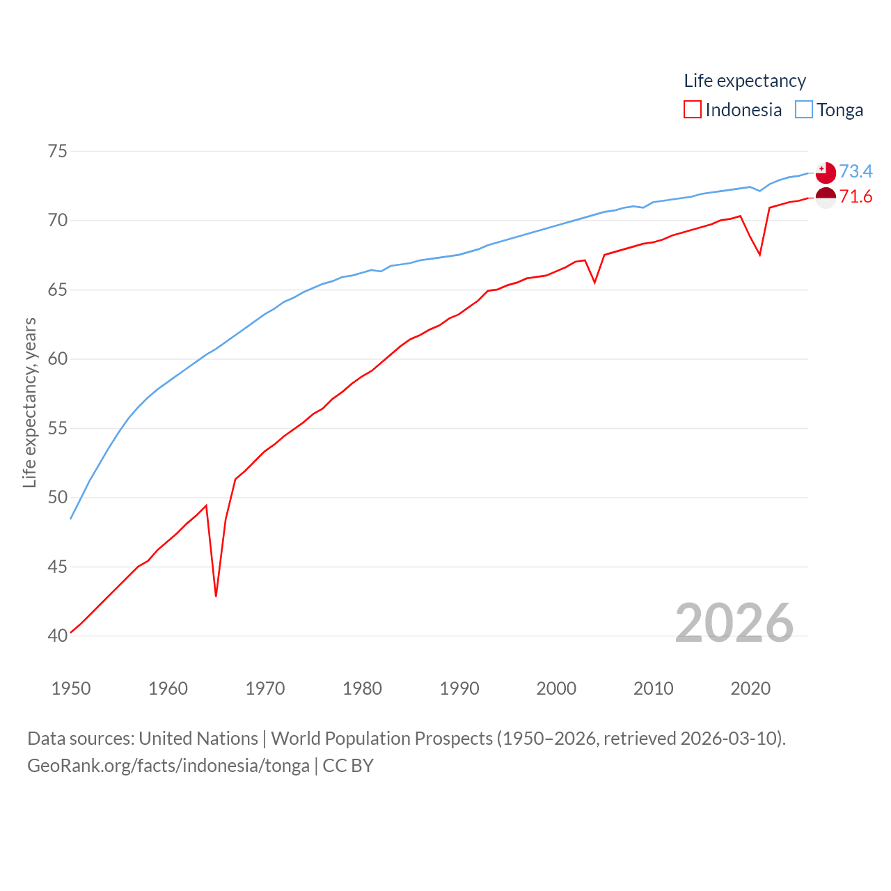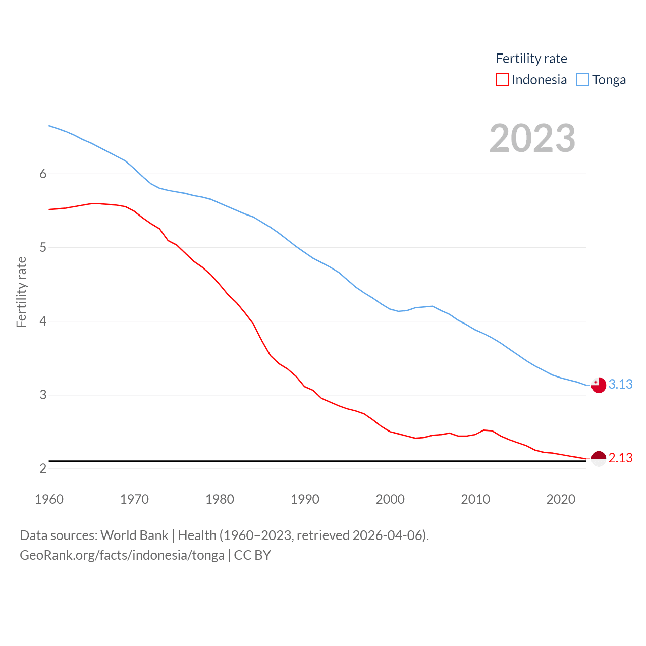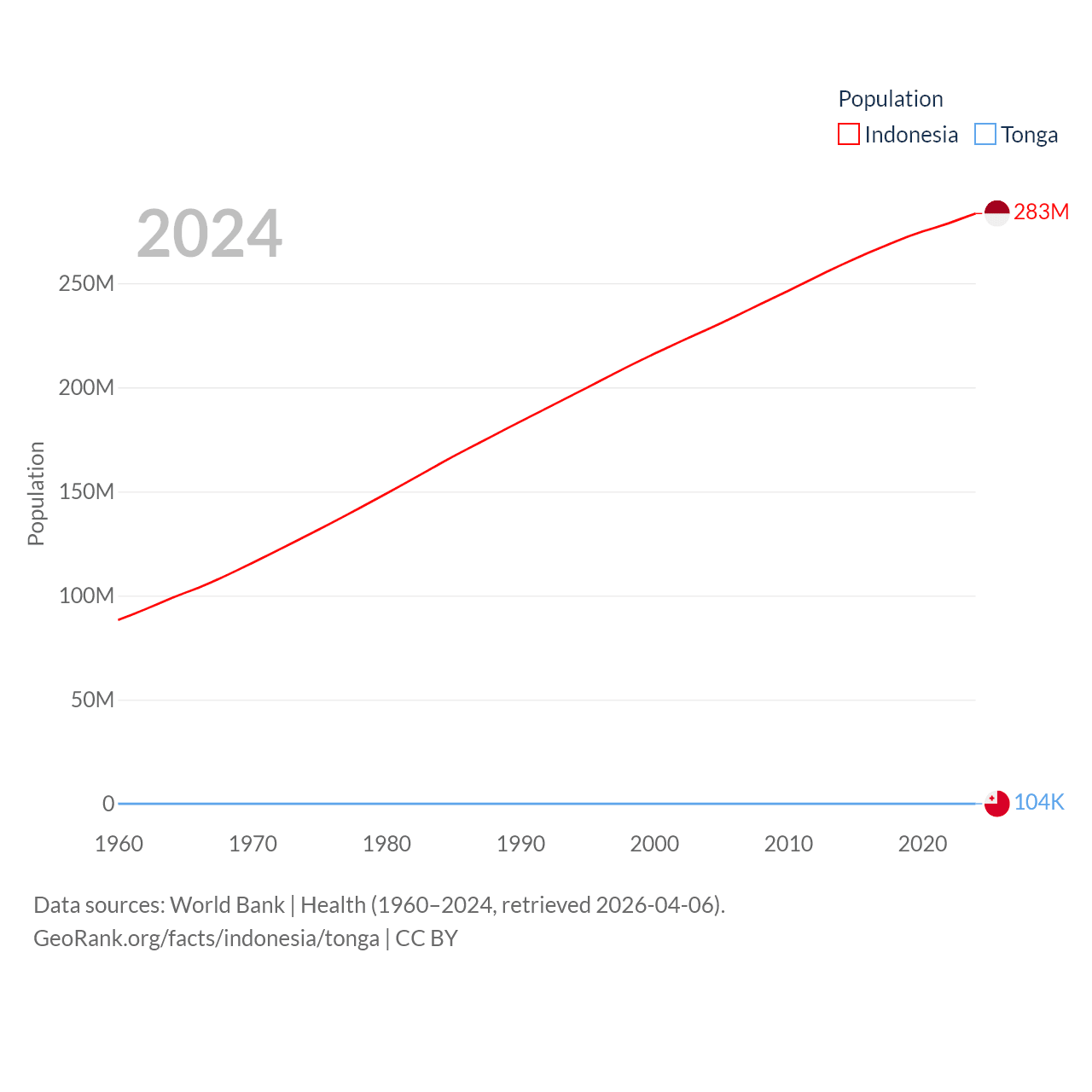 Indonesia has a population of 283M (ranked 4/197), compared with 104K in Tonga (ranked 183/197). Indonesia's land area is 730,720 sq mi versus 278 sq mi for Tonga (ranked 14th vs. 176th).
