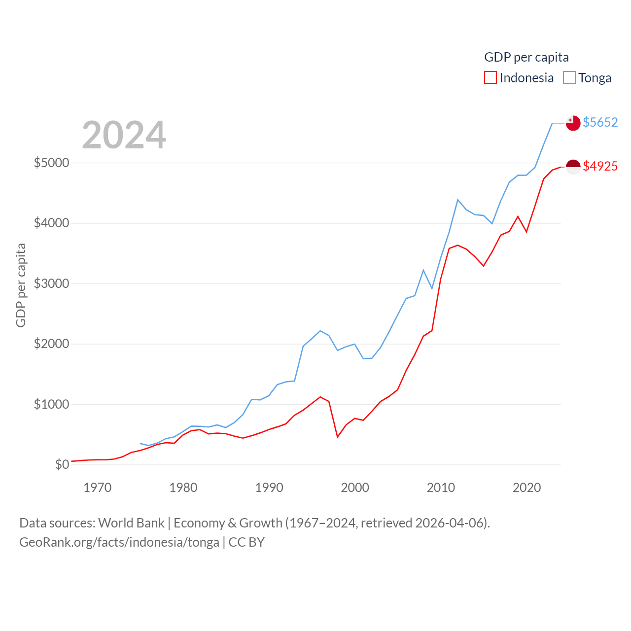By GDP, Indonesia ranks 16/197 ($1.4T) and Tonga ranks 191/197 ($591M). By GDP per capita, Indonesia ranks 121/197 ($4,925), while Tonga ranks 115/197 ($5,652).