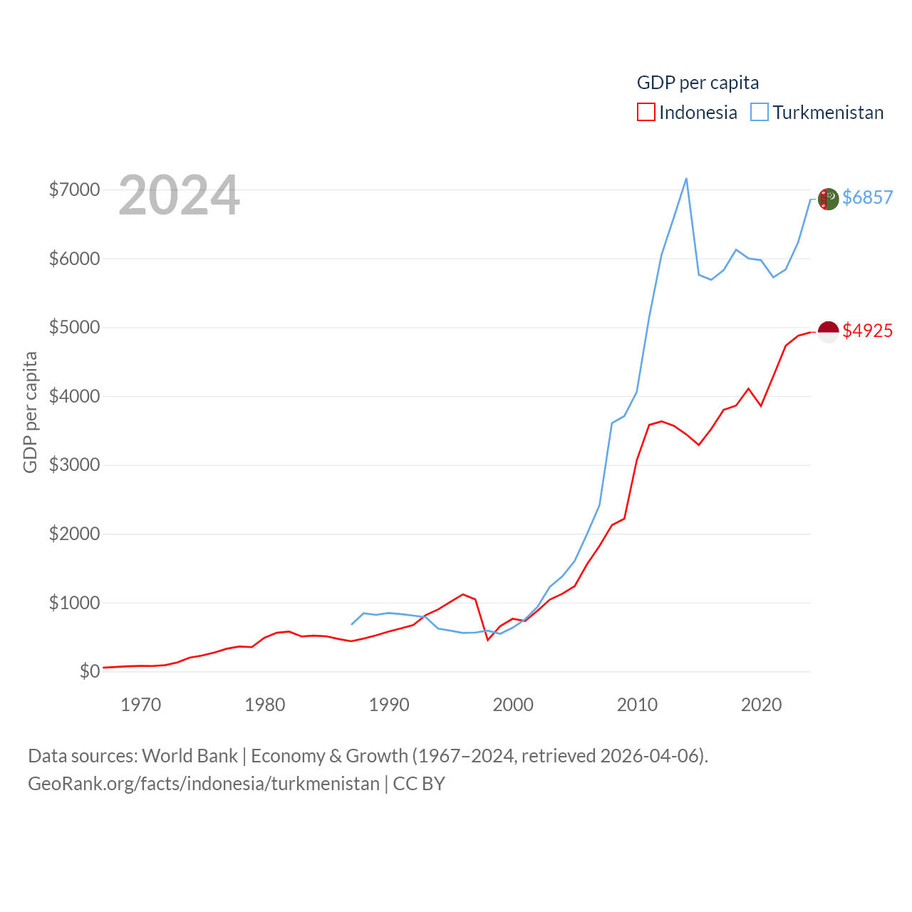 By GDP, Indonesia ranks 16/197 ($1.4T) and Turkmenistan ranks 92/197 ($51.4B). By GDP per capita, Indonesia ranks 121/197 ($4,925), while Turkmenistan ranks 104/197 ($6,857).