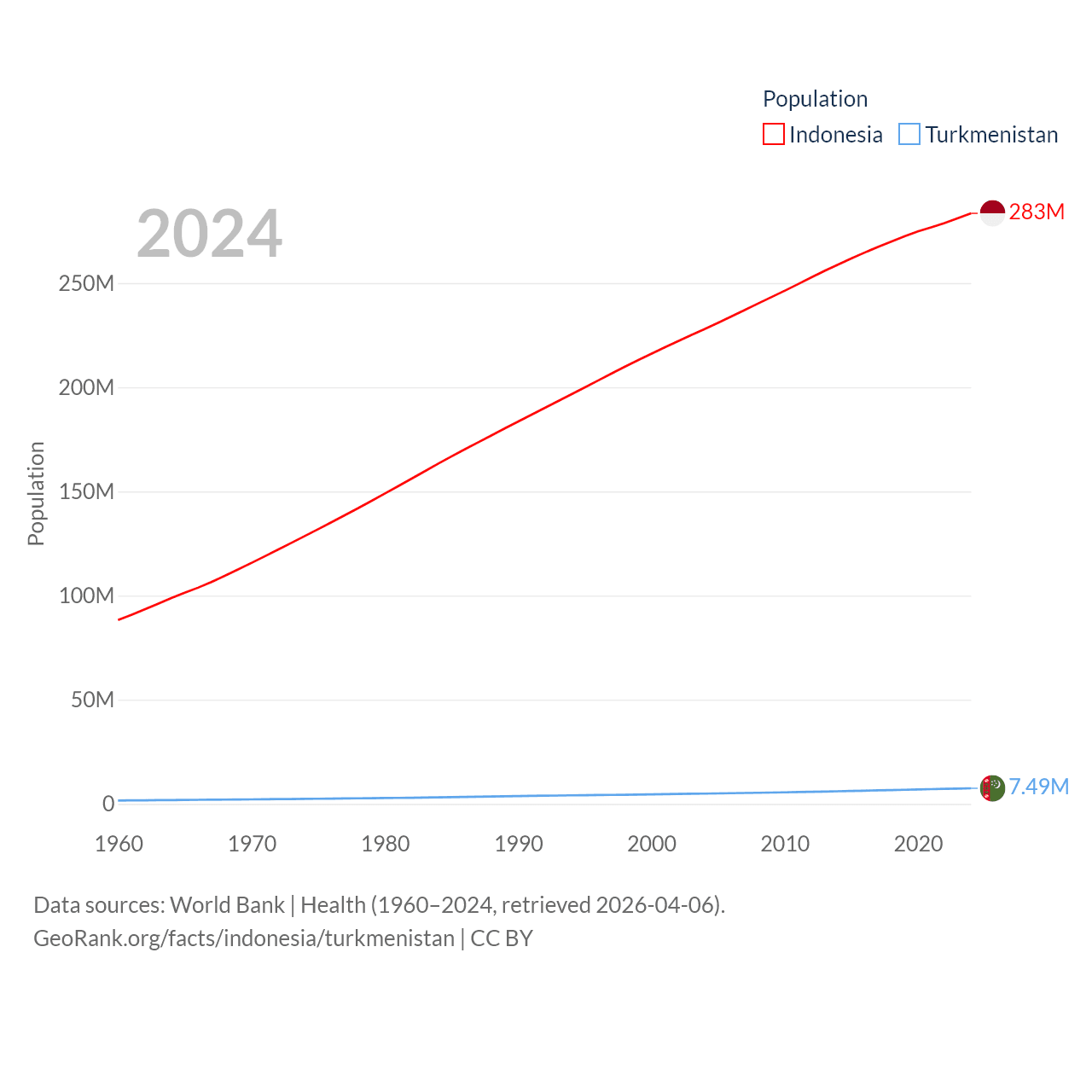 Indonesia has a population of 283M (ranked 4/197), compared with 7.49M in Turkmenistan (ranked 104/197). Indonesia's land area is 730,720 sq mi versus 181,441 sq mi for Turkmenistan (ranked 14th vs. 53rd).
