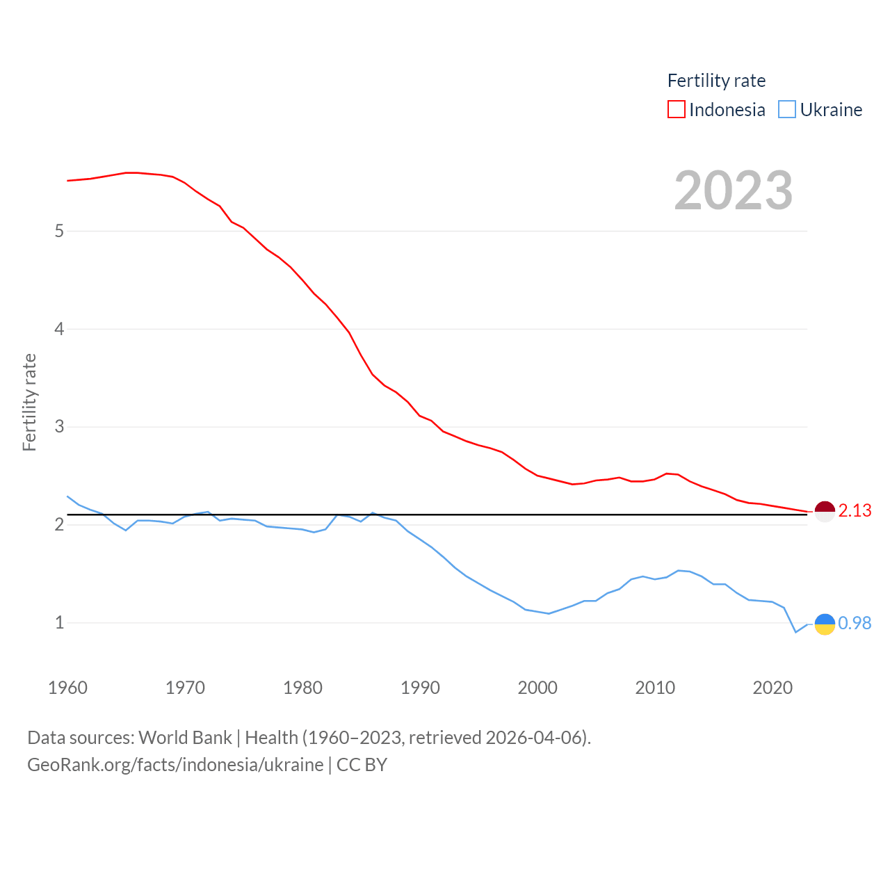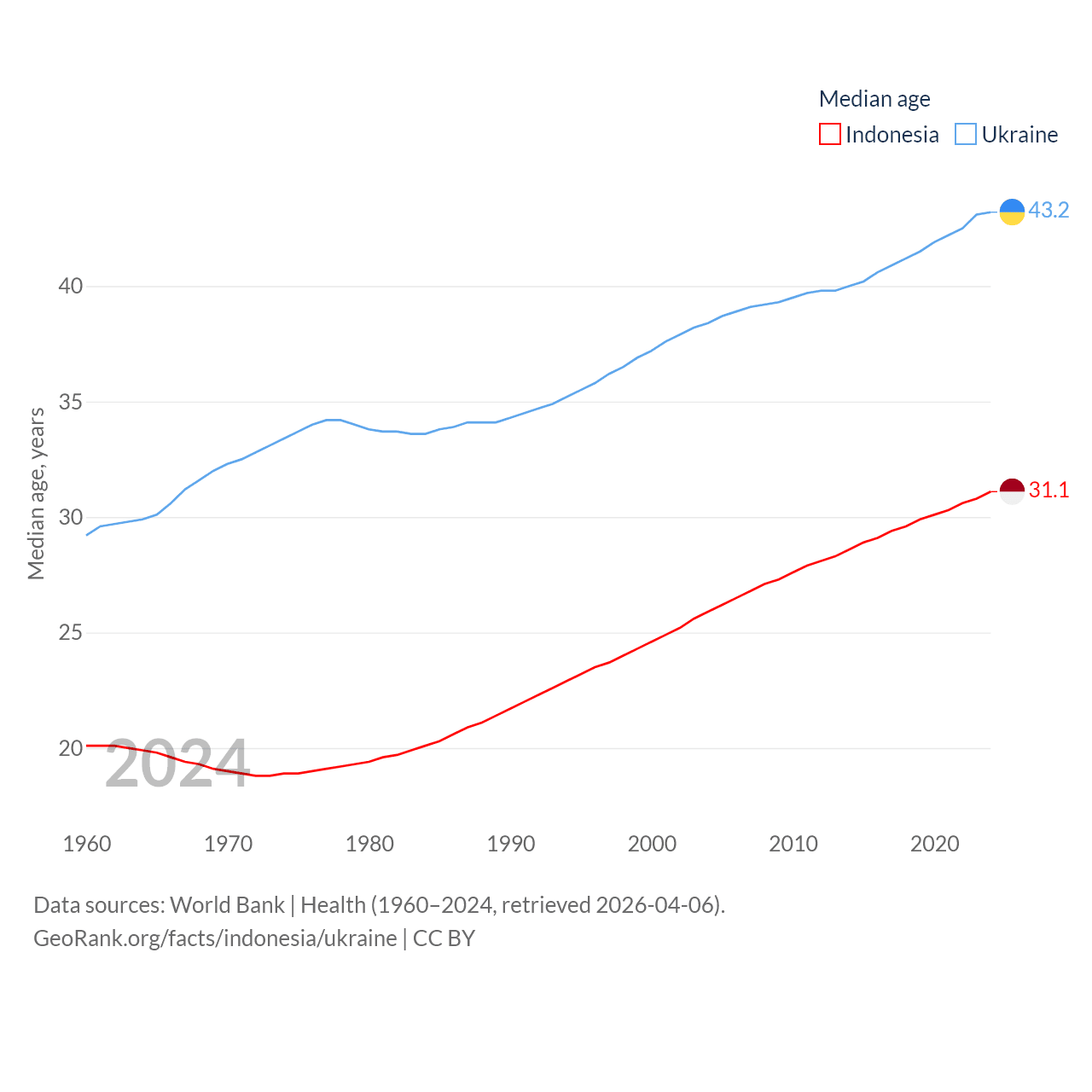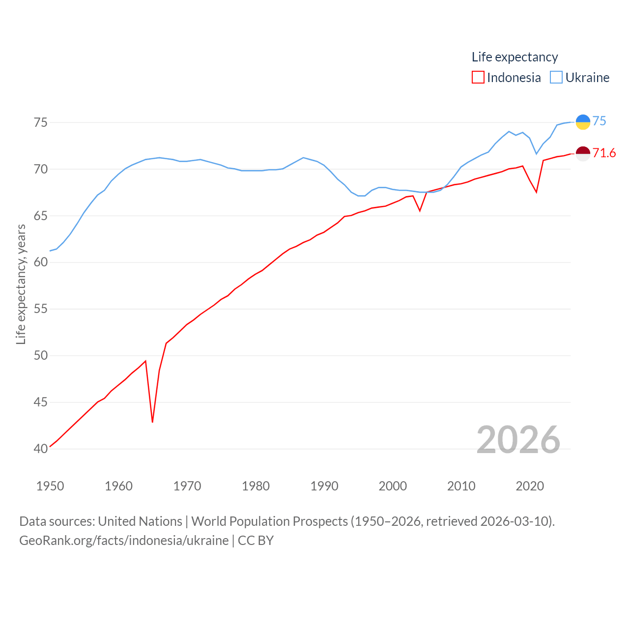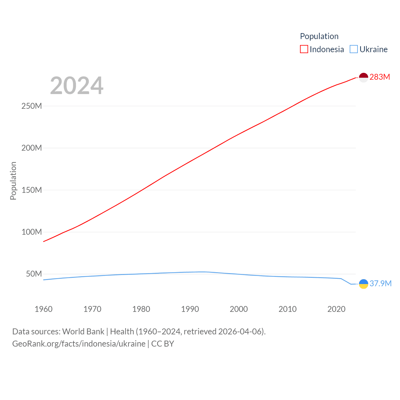 Indonesia has a population of 283M (ranked 4/197), compared with 37.9M in Ukraine (ranked 41/197). Indonesia's land area is 730,720 sq mi versus 223,708 sq mi for Ukraine (ranked 14th vs. 46th).