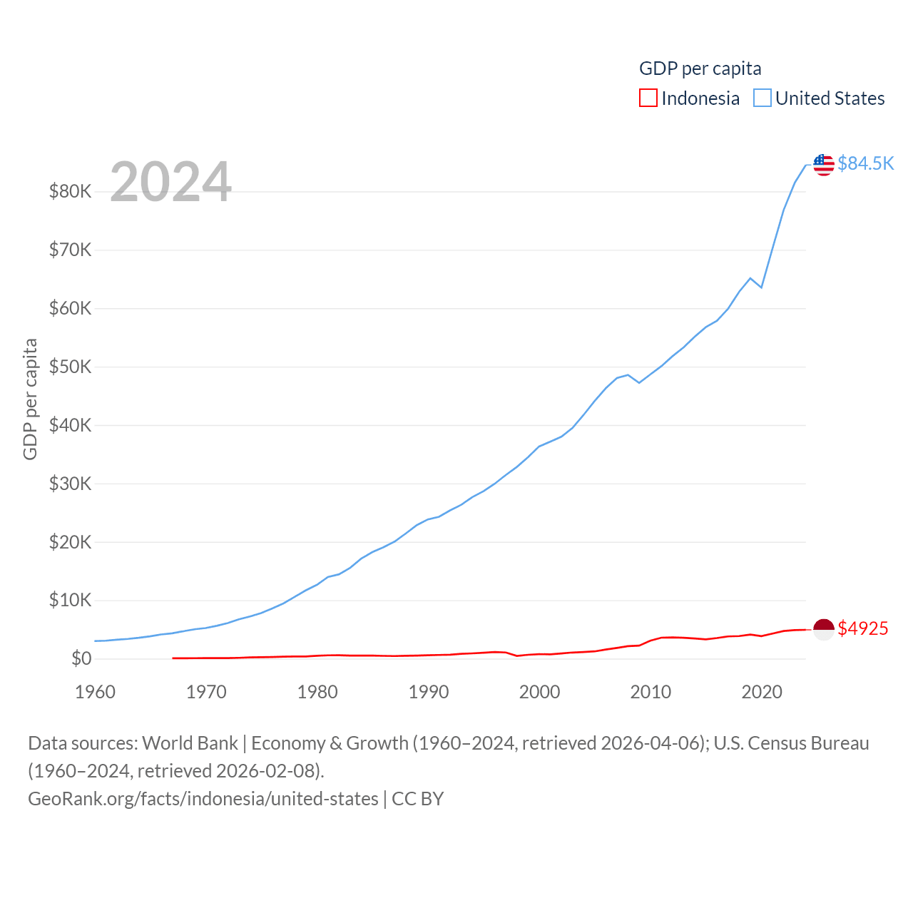 By GDP, Indonesia ranks 16/197 ($1.4T) and The United States ranks 1/197 ($28.8T). By GDP per capita, Indonesia ranks 121/197 ($4,925), while The United States ranks 10/197 ($84,534).