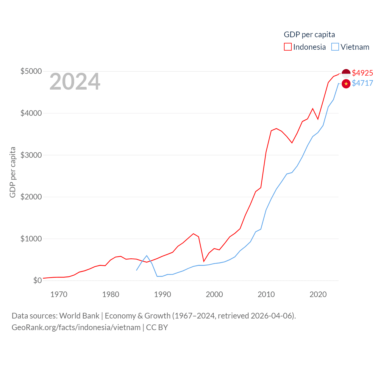 By GDP, Indonesia ranks 16/197 ($1.4T) and Vietnam ranks 33/197 ($476B). By GDP per capita, Indonesia ranks 121/197 ($4,925), while Vietnam ranks 122/197 ($4,717).