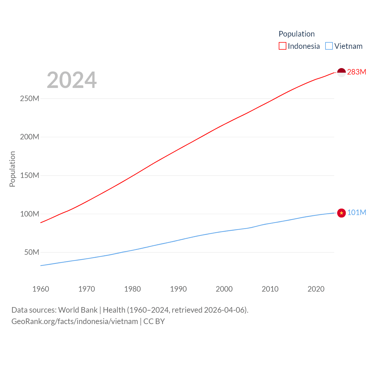 Indonesia has a population of 283M (ranked 4/197), compared with 101M in Vietnam (ranked 16/197). Indonesia's land area is 730,720 sq mi versus 121,016 sq mi for Vietnam (ranked 14th vs. 67th).