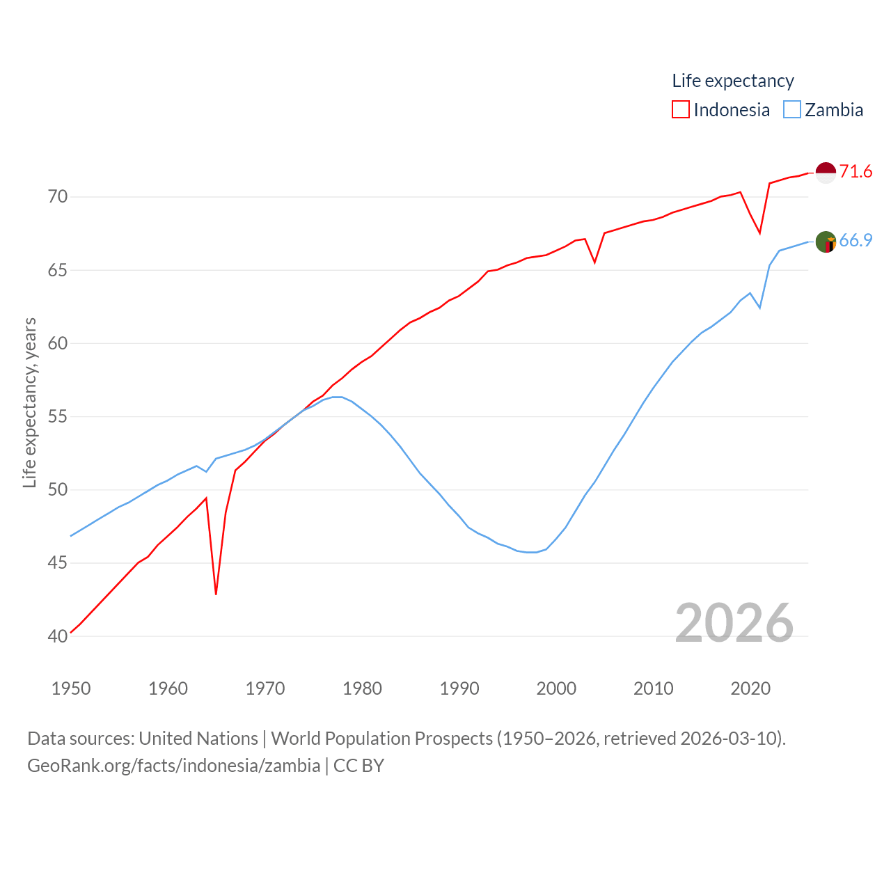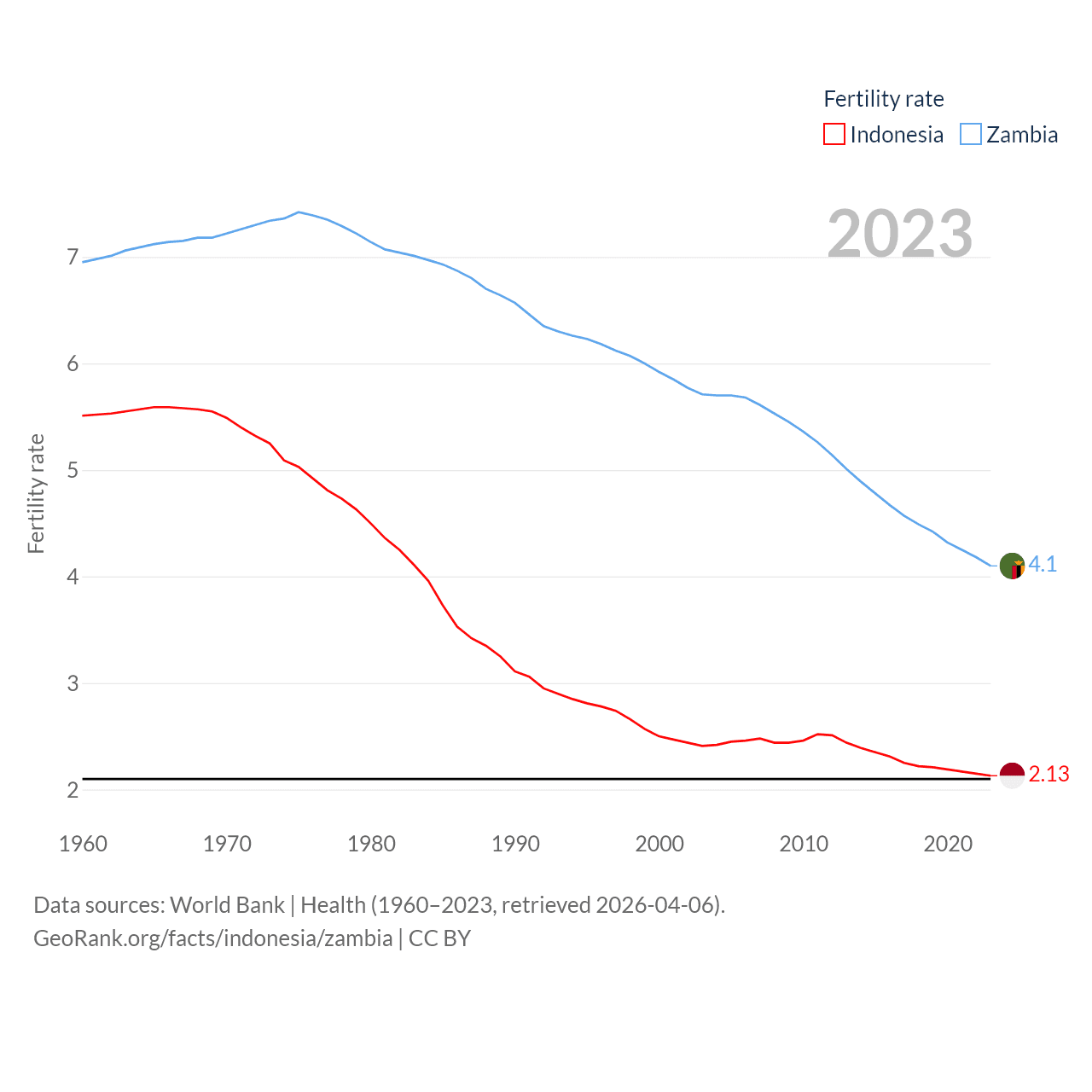 Indonesia has a population of 283M (ranked 4/197), compared with 21.3M in Zambia (ranked 63/197). Indonesia's land area is 730,720 sq mi versus 287,024 sq mi for Zambia (ranked 14th vs. 37th).