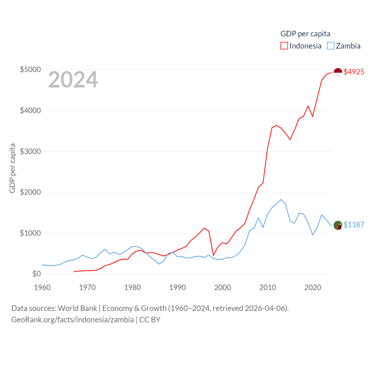By GDP, Indonesia ranks 16/197 ($1.4T) and Zambia ranks 116/197 ($25.3B). By GDP per capita, Indonesia ranks 121/197 ($4,925), while Zambia ranks 169/197 ($1,187).