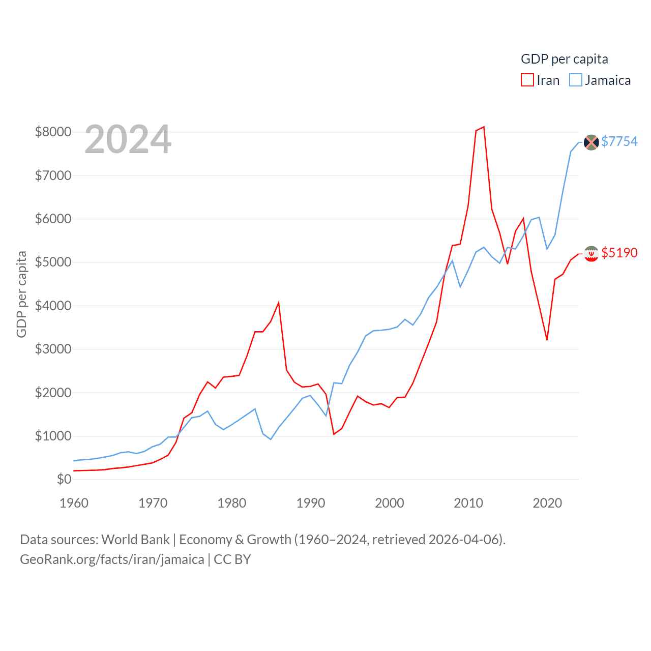 By GDP, Iran ranks 34/197 ($475B) and Jamaica ranks 124/197 ($22B). By GDP per capita, Iran ranks 119/197 ($5,190), while Jamaica ranks 95/197 ($7,754).