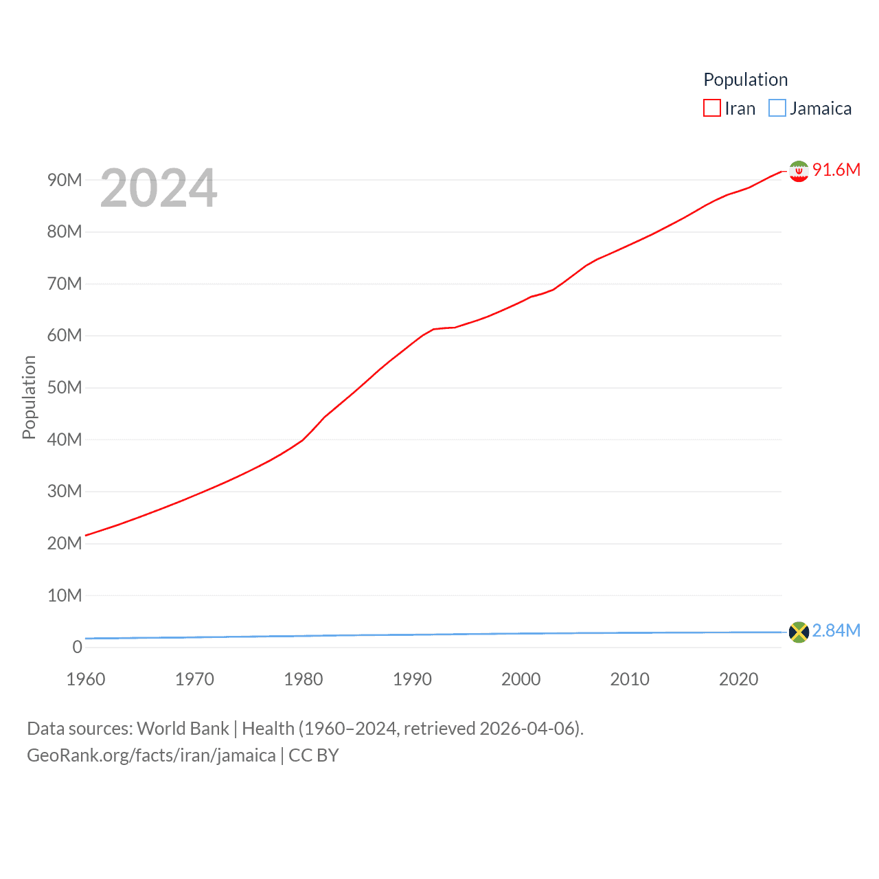 Iran has a population of 91.6M (ranked 17/197), compared with 2.84M in Jamaica (ranked 139/197). Iran's land area is 626,451 sq mi versus 4,181 sq mi for Jamaica (ranked 17th vs. 159th).