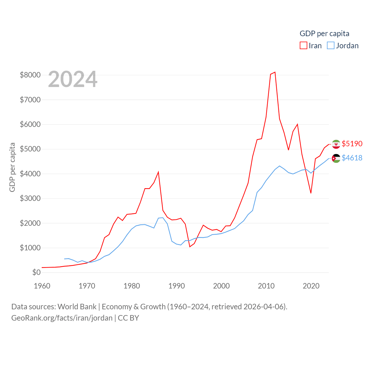 By GDP, Iran ranks 34/197 ($475B) and Jordan ranks 90/197 ($53.4B). By GDP per capita, Iran ranks 119/197 ($5,190), while Jordan ranks 123/197 ($4,618).