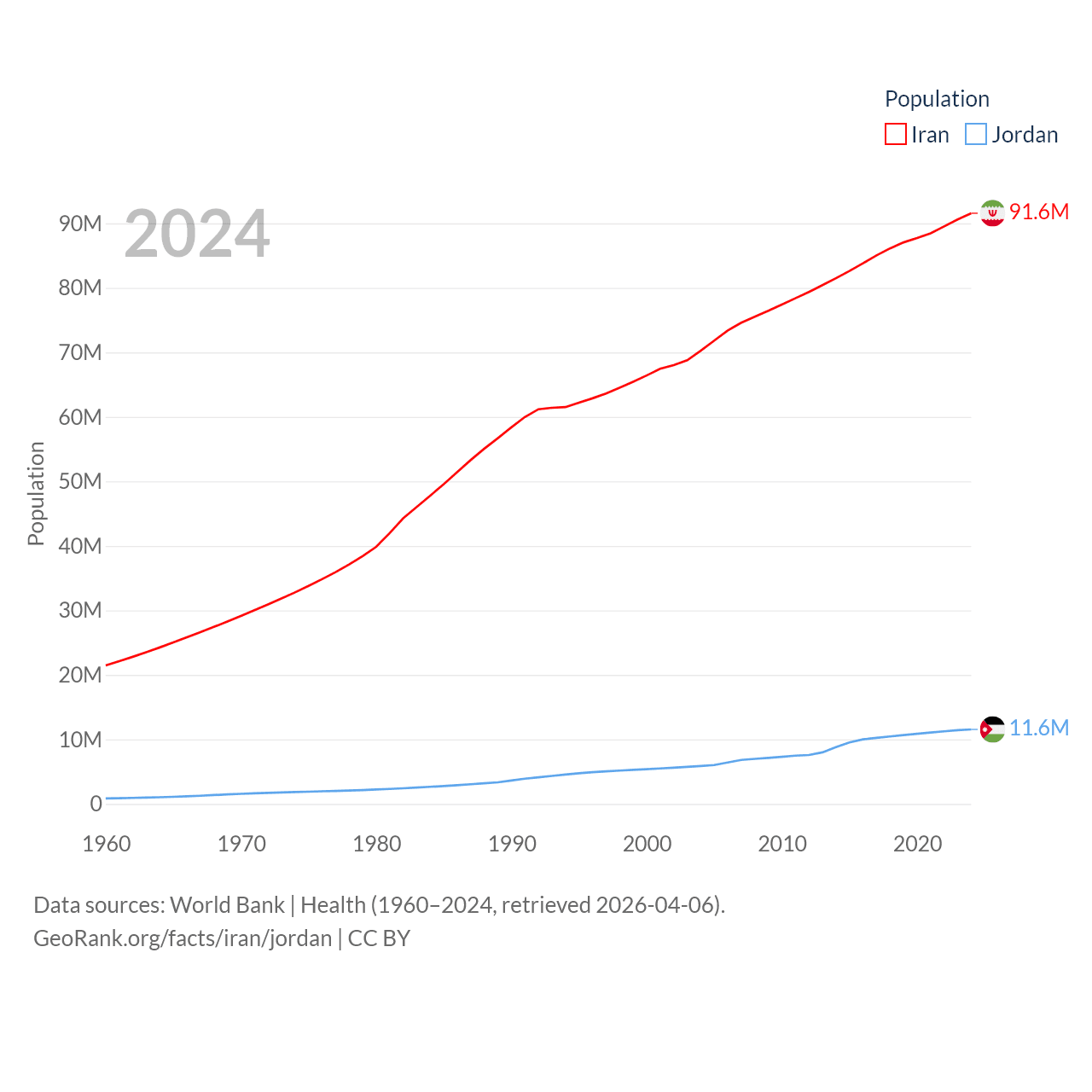 Iran has a population of 91.6M (ranked 17/197), compared with 11.6M in Jordan (ranked 84/197). Iran's land area is 626,451 sq mi versus 34,284 sq mi for Jordan (ranked 17th vs. 110th).