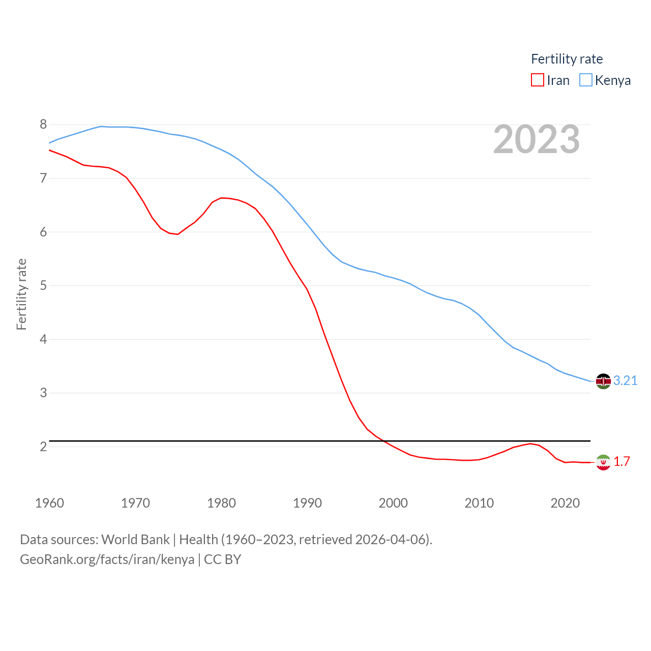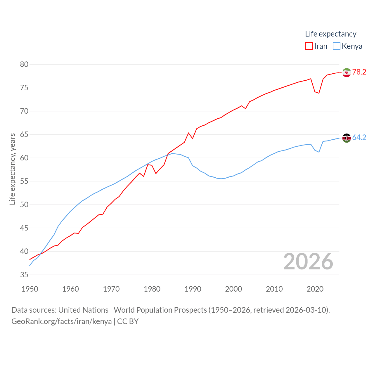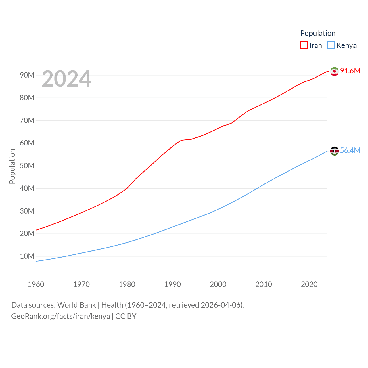 Iran has a population of 91.6M (ranked 17/197), compared with 56.4M in Kenya (ranked 26/197). Iran's land area is 626,451 sq mi versus 224,278 sq mi for Kenya (ranked 17th vs. 45th).