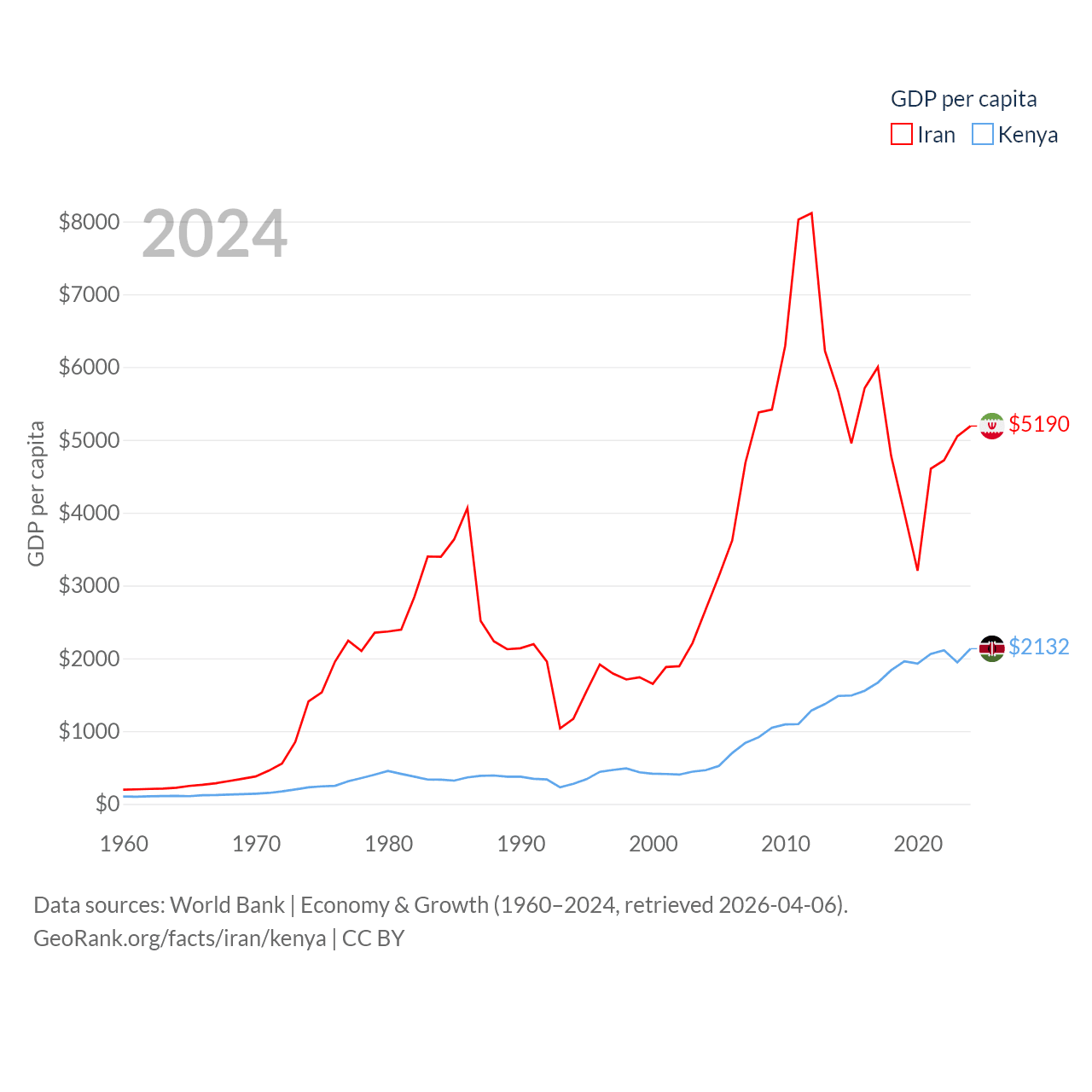 By GDP, Iran ranks 34/197 ($475B) and Kenya ranks 64/197 ($120B). By GDP per capita, Iran ranks 119/197 ($5,190), while Kenya ranks 154/197 ($2,132).