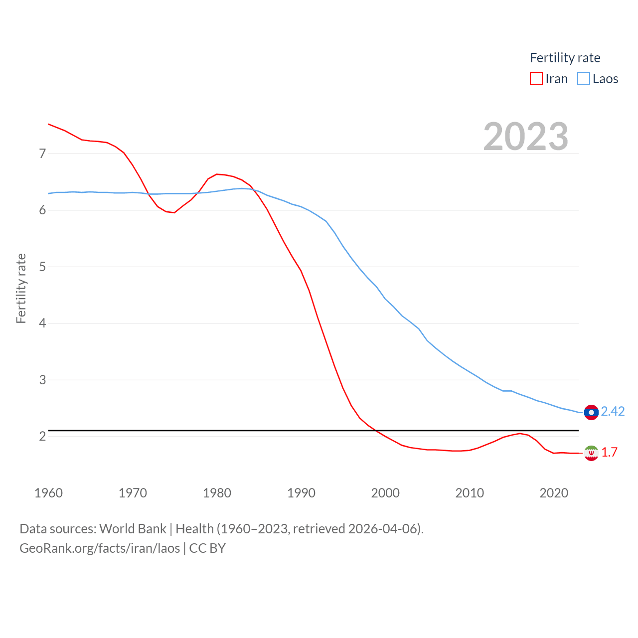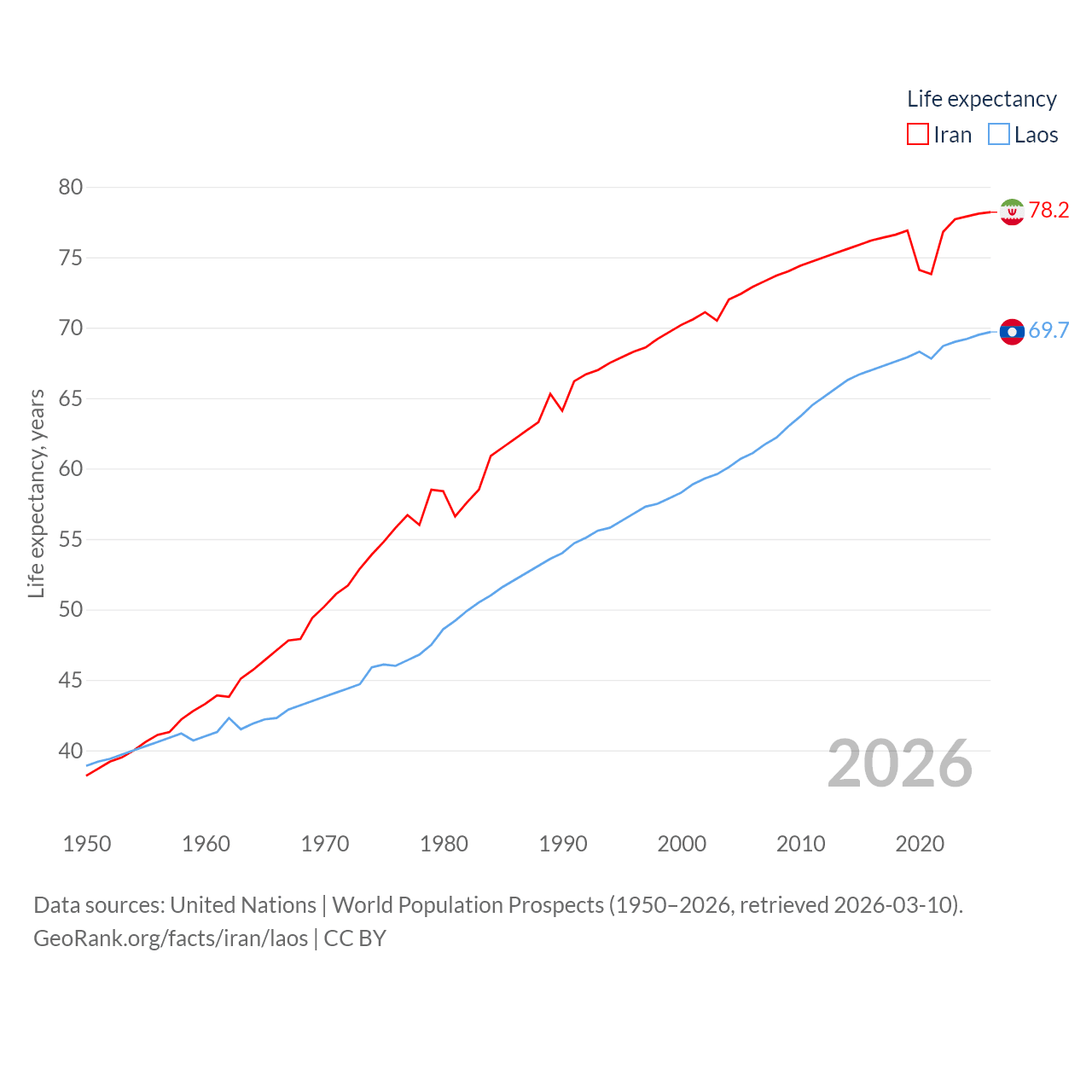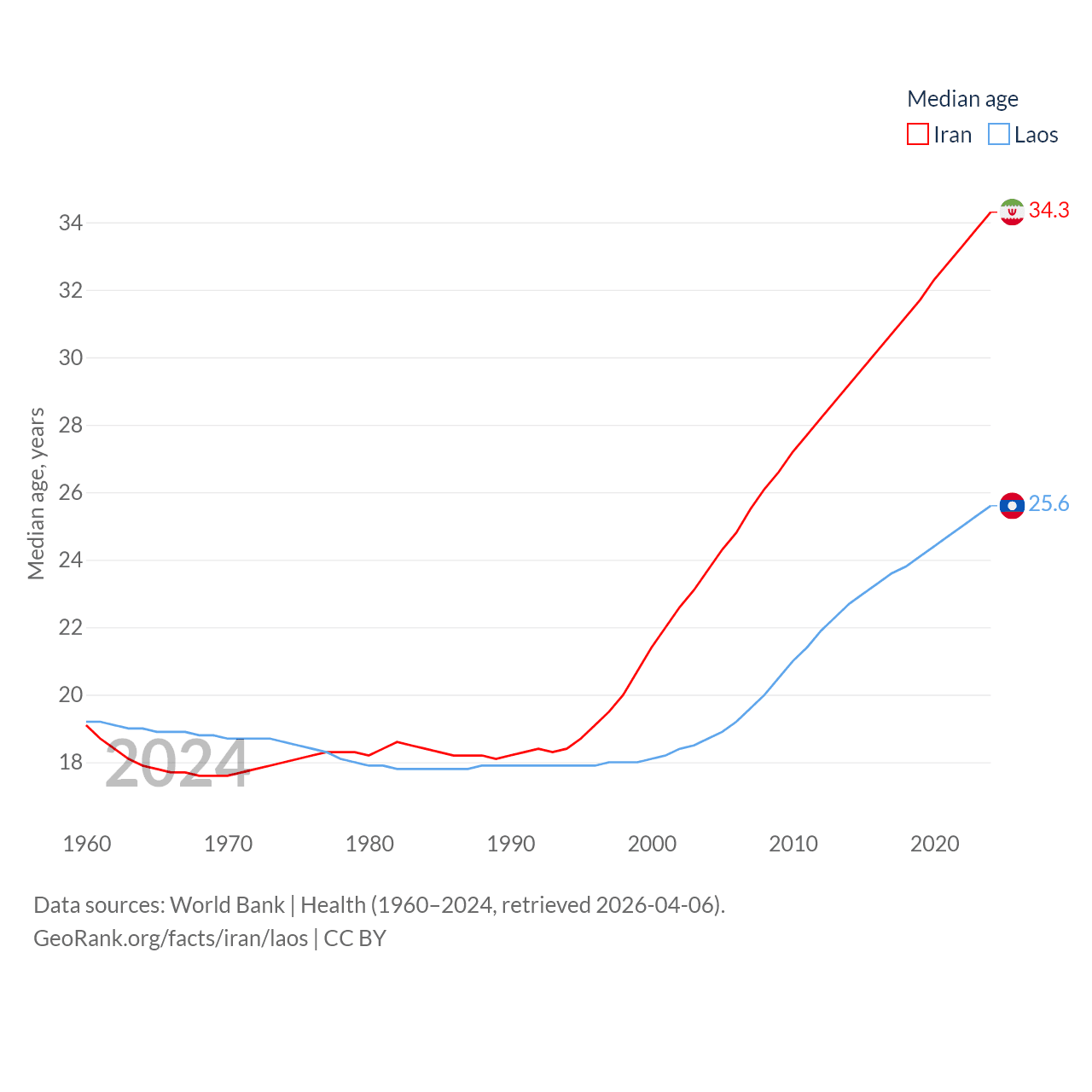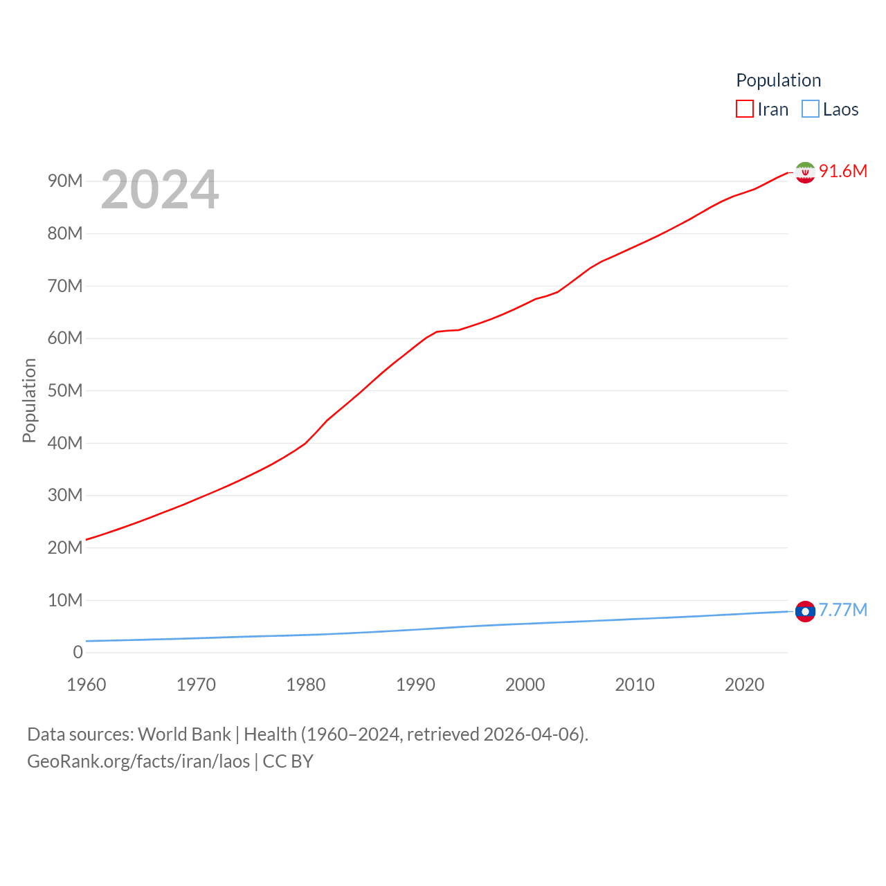 Iran has a population of 91.6M (ranked 17/197), compared with 7.77M in Laos (ranked 103/197). Iran's land area is 626,451 sq mi versus 89,112 sq mi for Laos (ranked 17th vs. 79th).