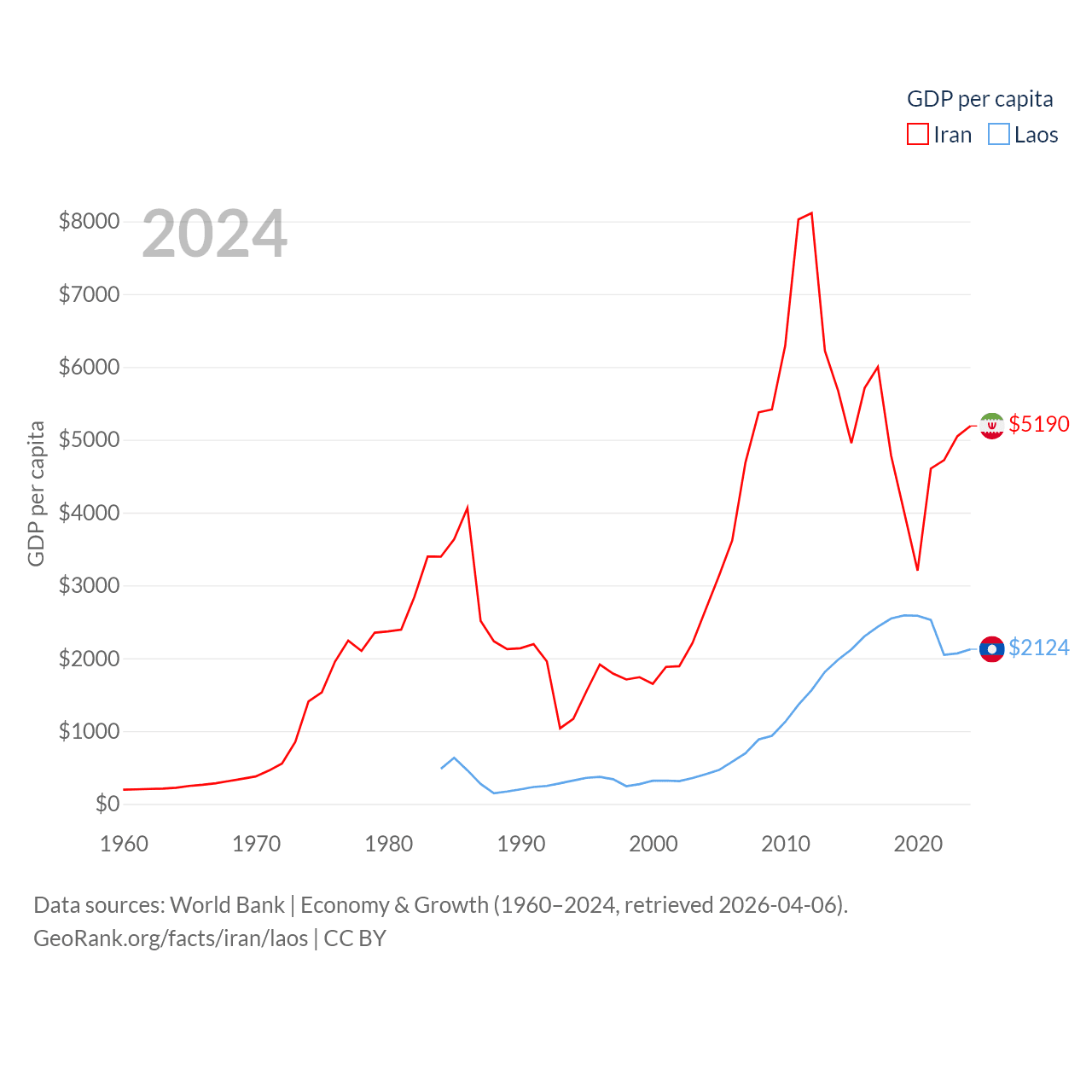By GDP, Iran ranks 34/197 ($475B) and Laos ranks 139/197 ($16.5B). By GDP per capita, Iran ranks 119/197 ($5,190), while Laos ranks 155/197 ($2,124).
