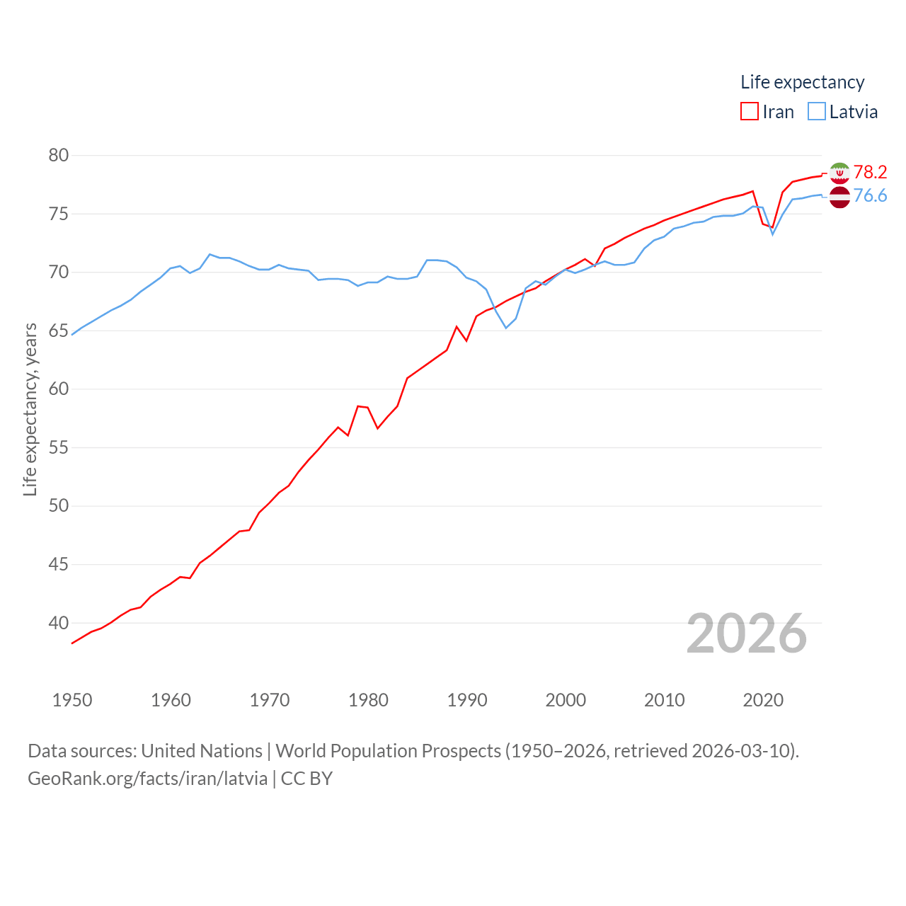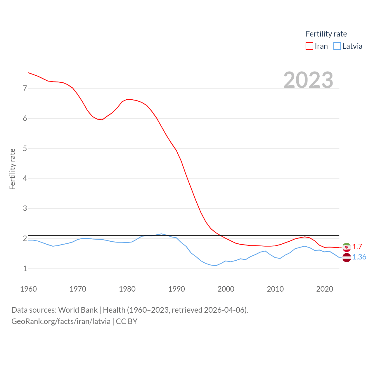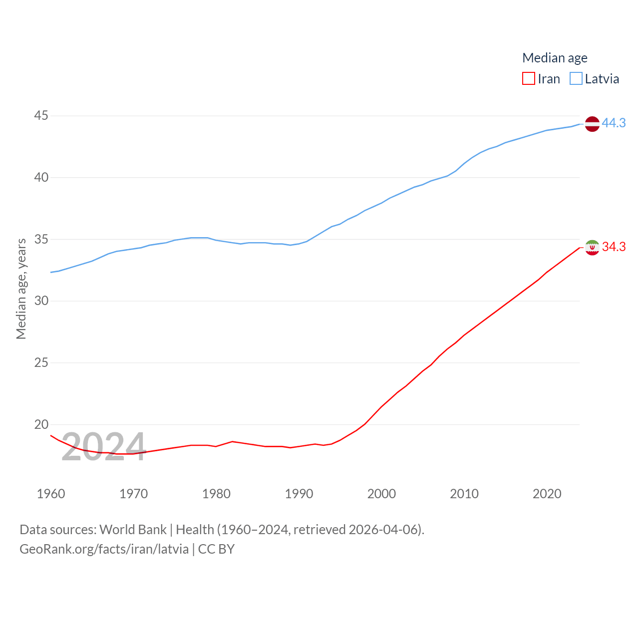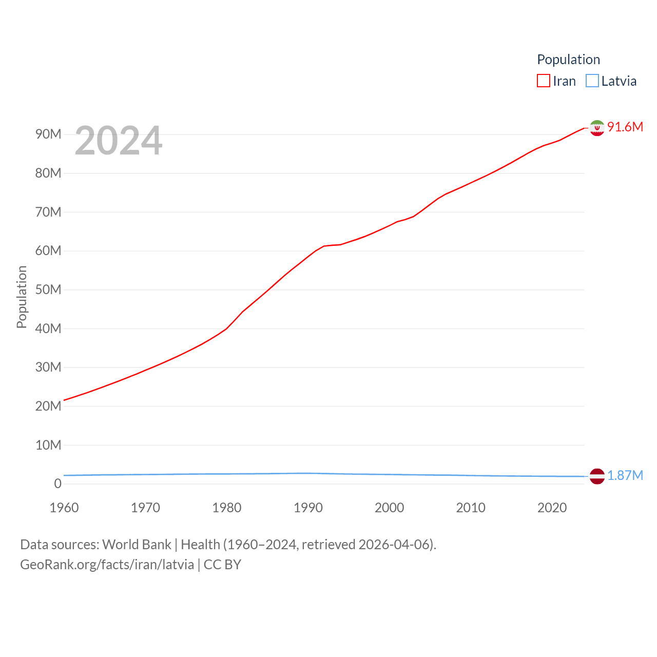 Iran has a population of 91.6M (ranked 17/197), compared with 1.87M in Latvia (ranked 149/197). Iran's land area is 626,451 sq mi versus 24,027 sq mi for Latvia (ranked 17th vs. 121st).