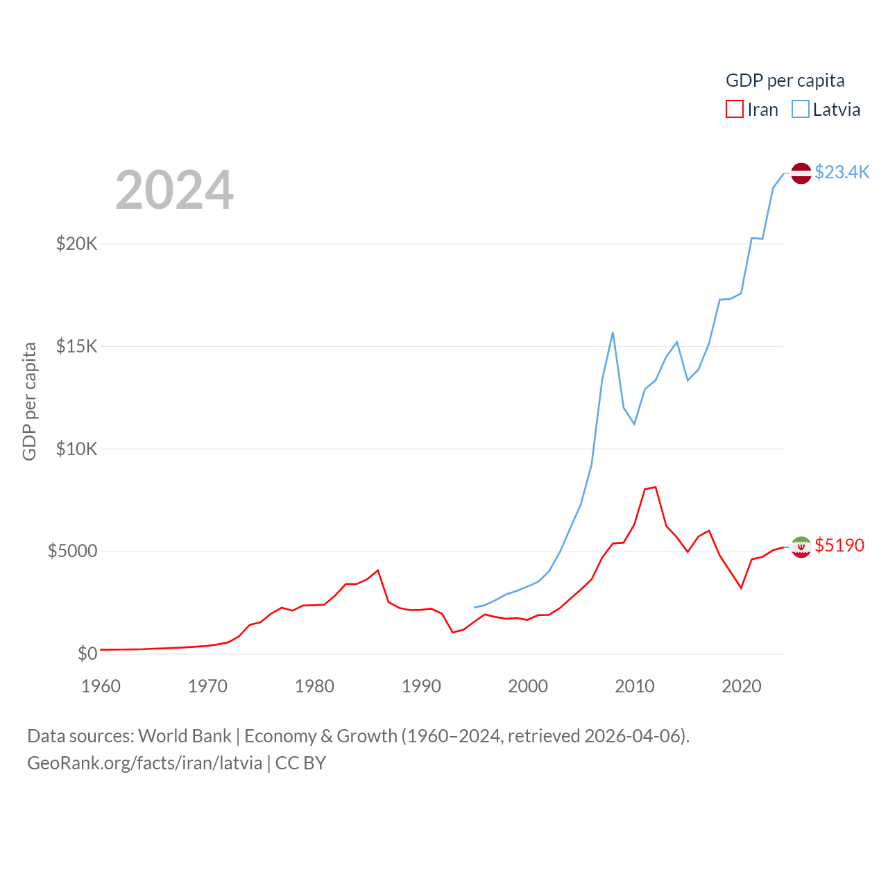 By GDP, Iran ranks 34/197 ($475B) and Latvia ranks 99/197 ($43.7B). By GDP per capita, Iran ranks 119/197 ($5,190), while Latvia ranks 54/197 ($23,409).