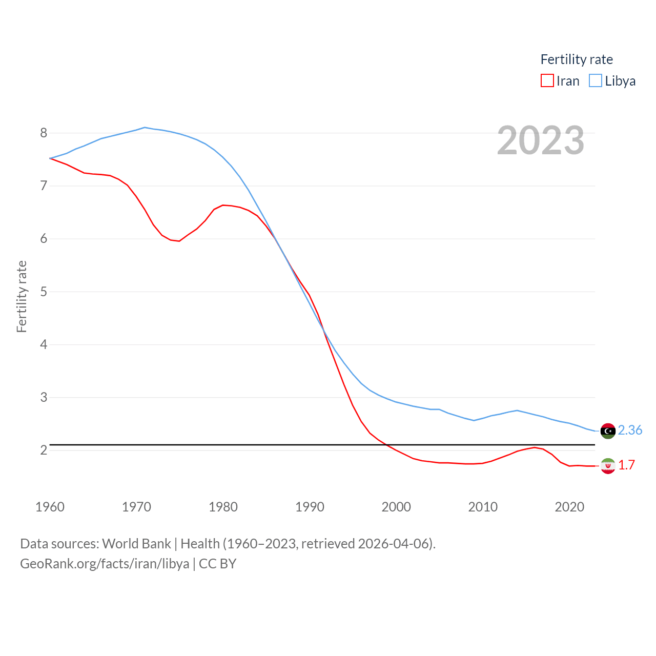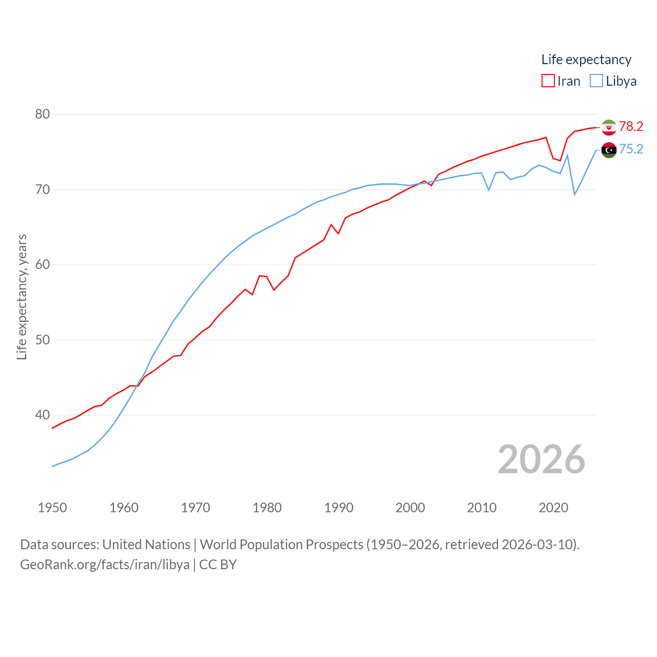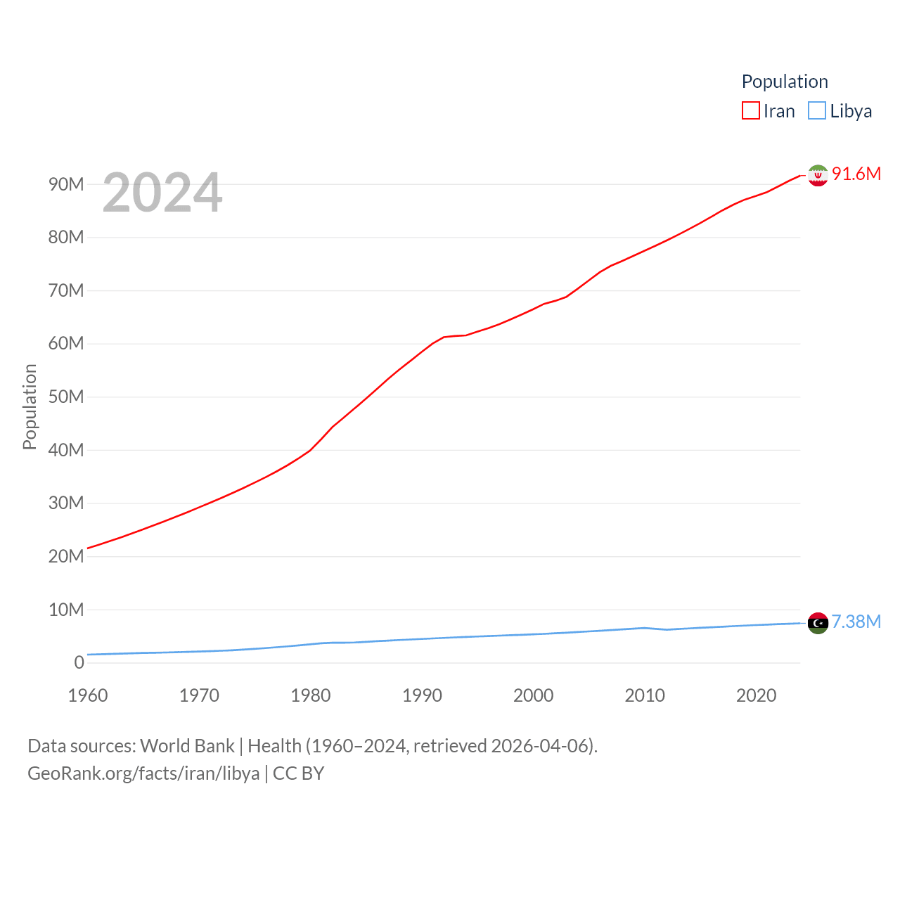 Iran has a population of 91.6M (ranked 17/197), compared with 7.38M in Libya (ranked 105/197). Iran's land area is 626,451 sq mi versus 679,362 sq mi for Libya (ranked 17th vs. 16th).