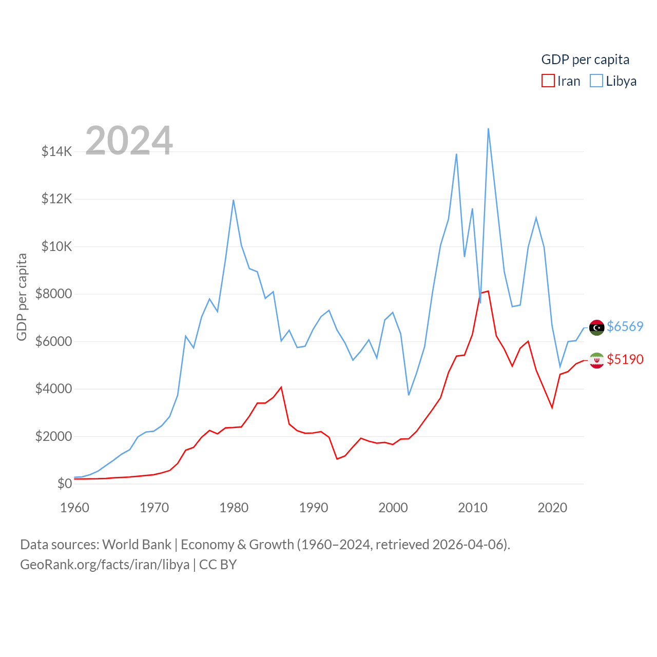 By GDP, Iran ranks 34/197 ($475B) and Libya ranks 95/197 ($48.5B). By GDP per capita, Iran ranks 119/197 ($5,190), while Libya ranks 107/197 ($6,569).
