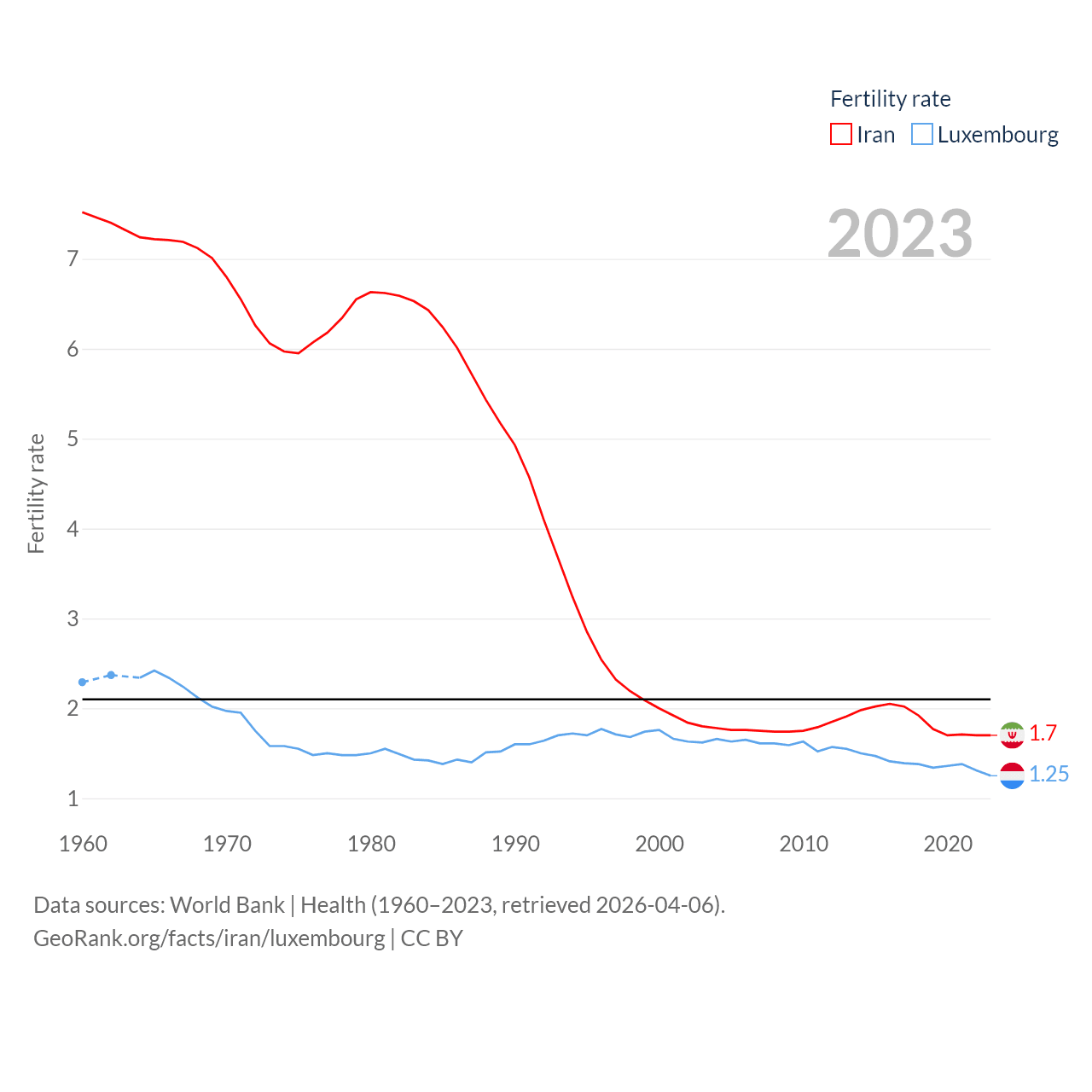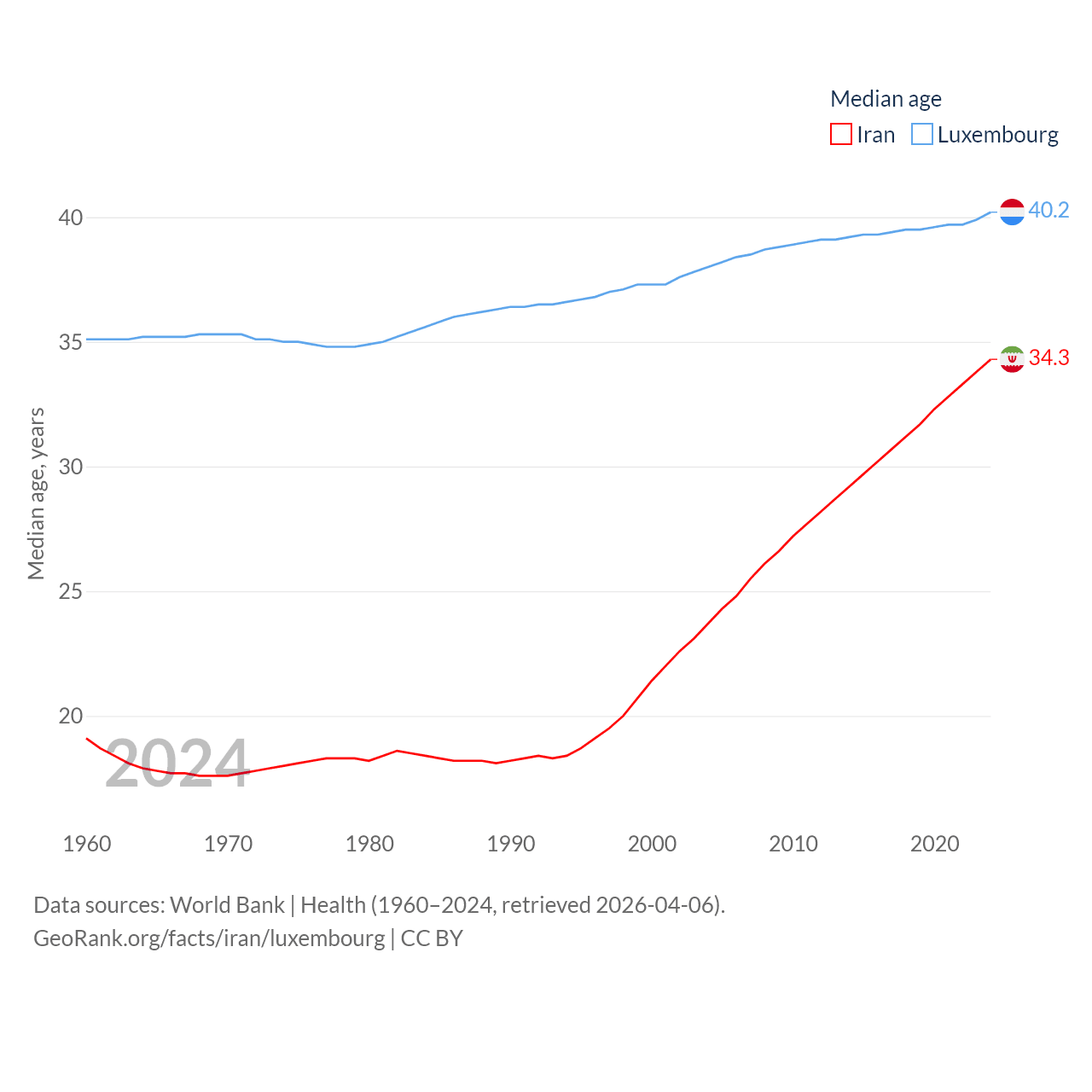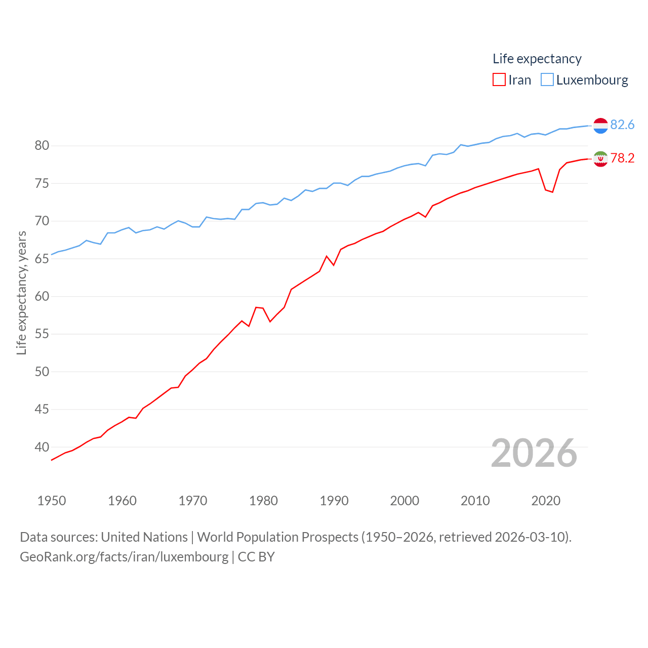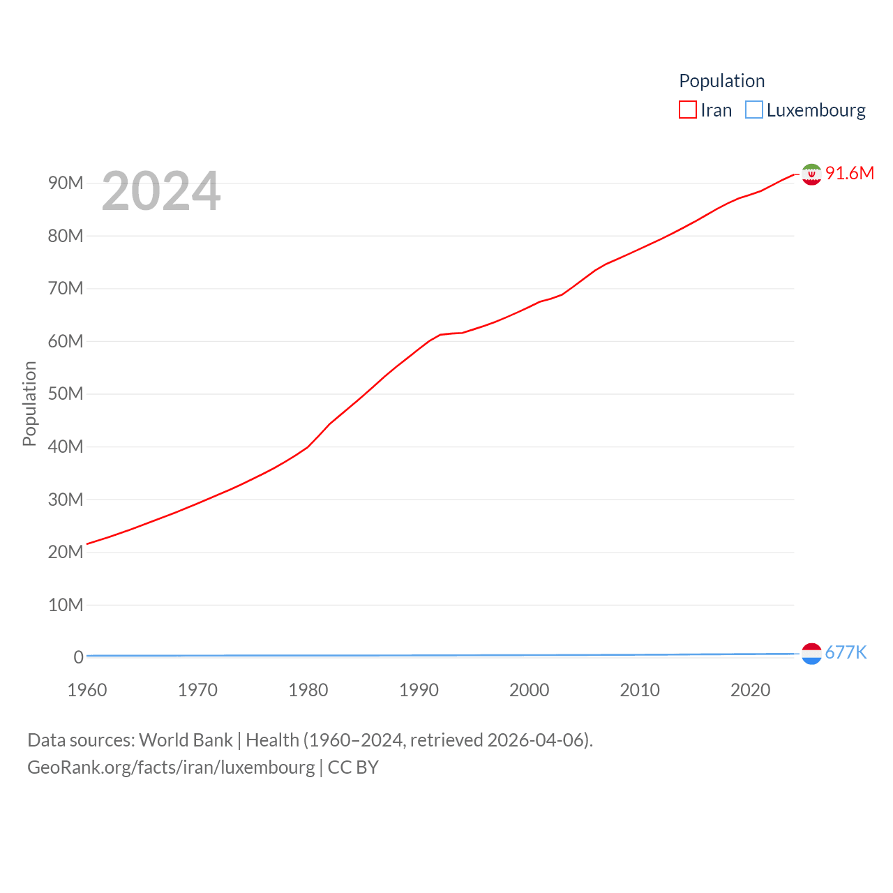 Iran has a population of 91.6M (ranked 17/197), compared with 677K in Luxembourg (ranked 164/197). Iran's land area is 626,451 sq mi versus 994 sq mi for Luxembourg (ranked 17th vs. 169th).