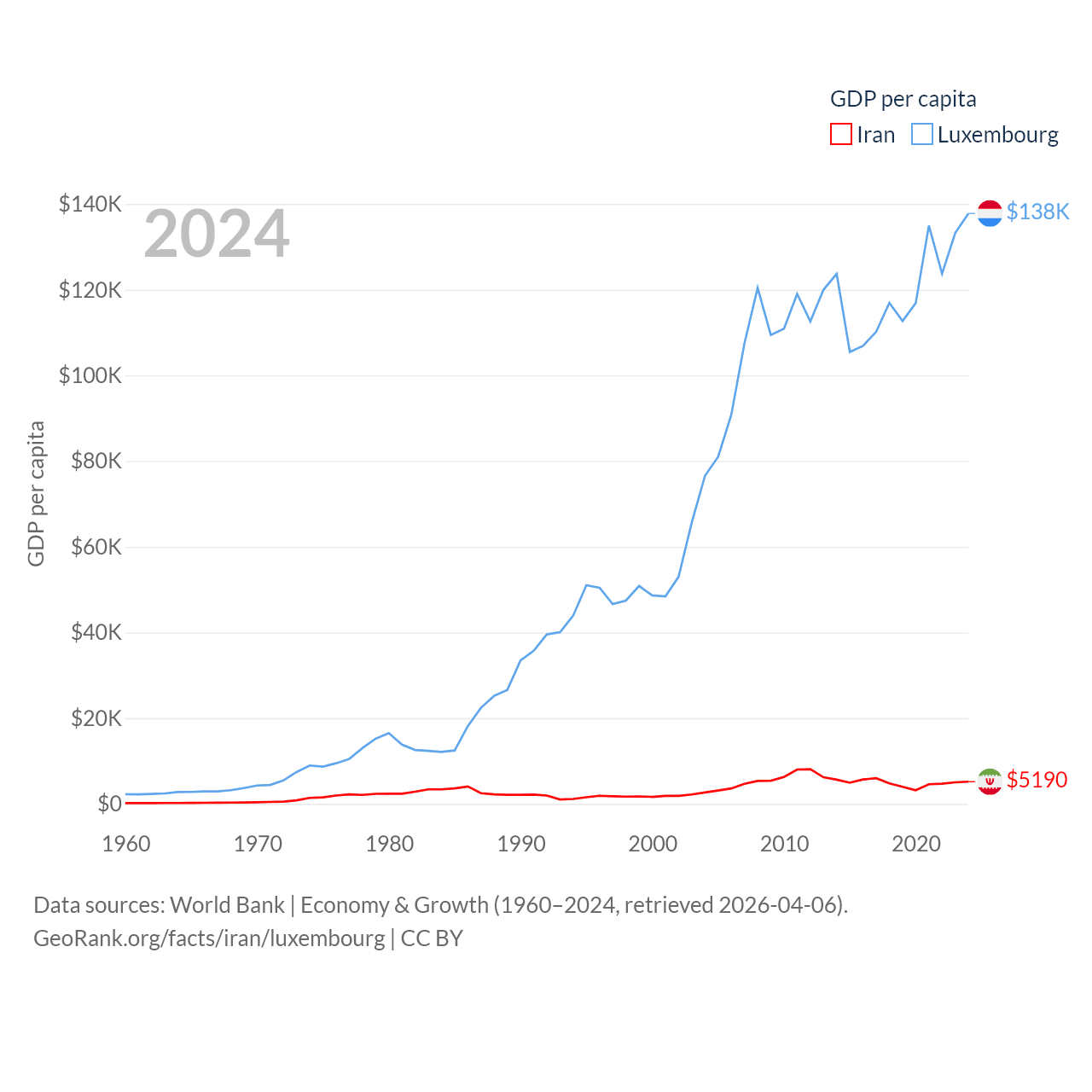 By GDP, Iran ranks 34/197 ($475B) and Luxembourg ranks 74/197 ($93.3B). By GDP per capita, Iran ranks 119/197 ($5,190), while Luxembourg ranks 3/197 ($137,782).