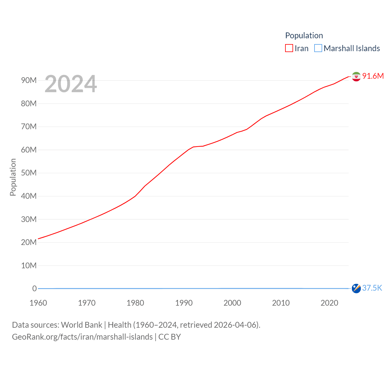 Iran has a population of 91.6M (ranked 17/197), compared with 37.5K in The Marshall Islands (ranked 192/197). Iran's land area is 626,451 sq mi versus 69.5 sq mi for The Marshall Islands (ranked 17th vs. 191st).