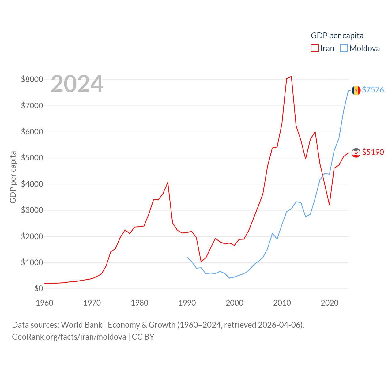 By GDP, Iran ranks 34/197 ($475B) and Moldova ranks 134/197 ($18.2B). By GDP per capita, Iran ranks 119/197 ($5,190), while Moldova ranks 99/197 ($7,576).