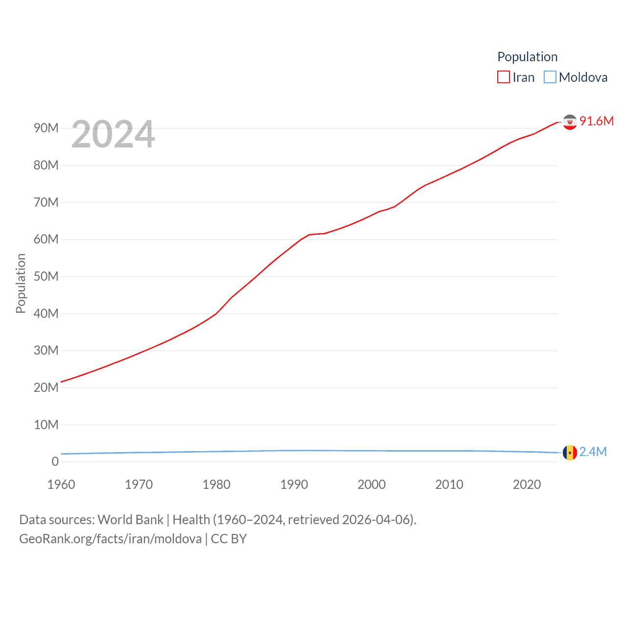 Iran has a population of 91.6M (ranked 17/197), compared with 2.4M in Moldova (ranked 143/197). Iran's land area is 626,451 sq mi versus 12,714 sq mi for Moldova (ranked 17th vs. 135th).