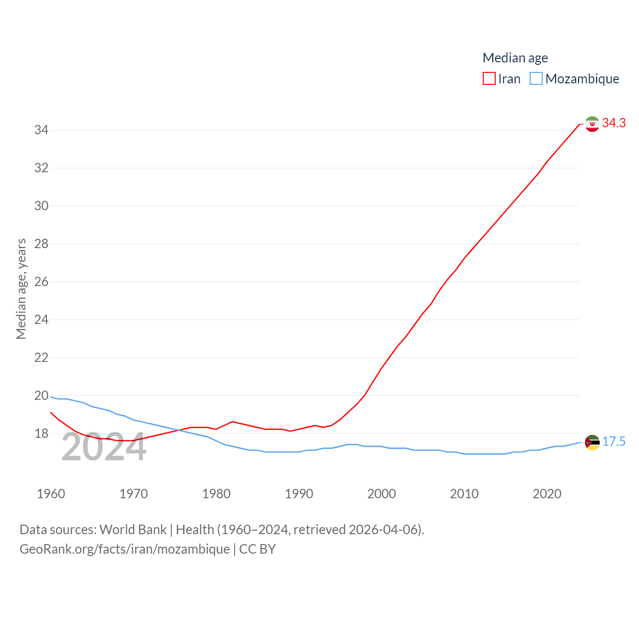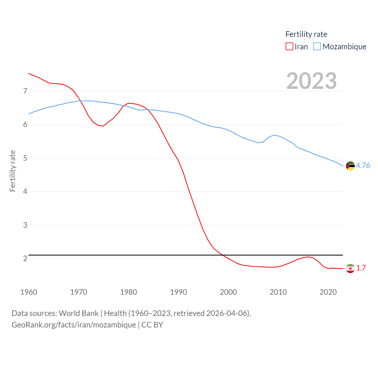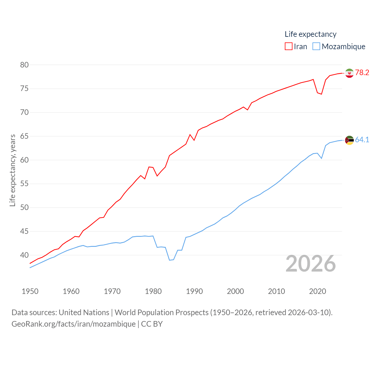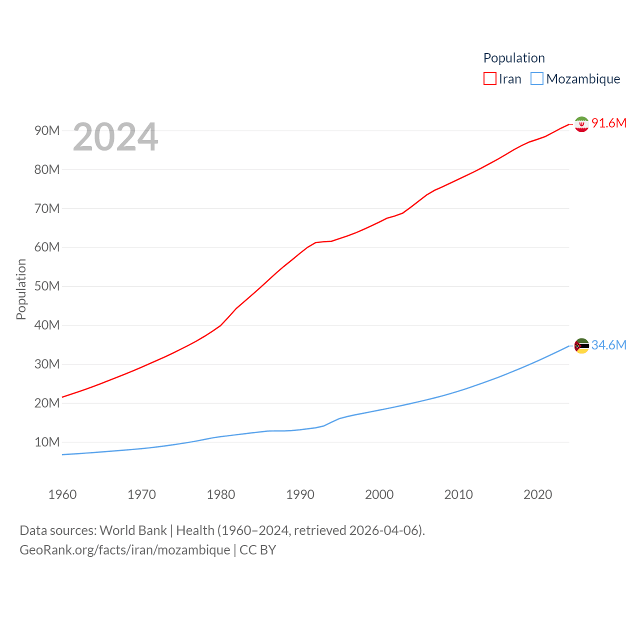 Iran has a population of 91.6M (ranked 17/197), compared with 34.6M in Mozambique (ranked 46/197). Iran's land area is 626,451 sq mi versus 303,623 sq mi for Mozambique (ranked 17th vs. 34th).