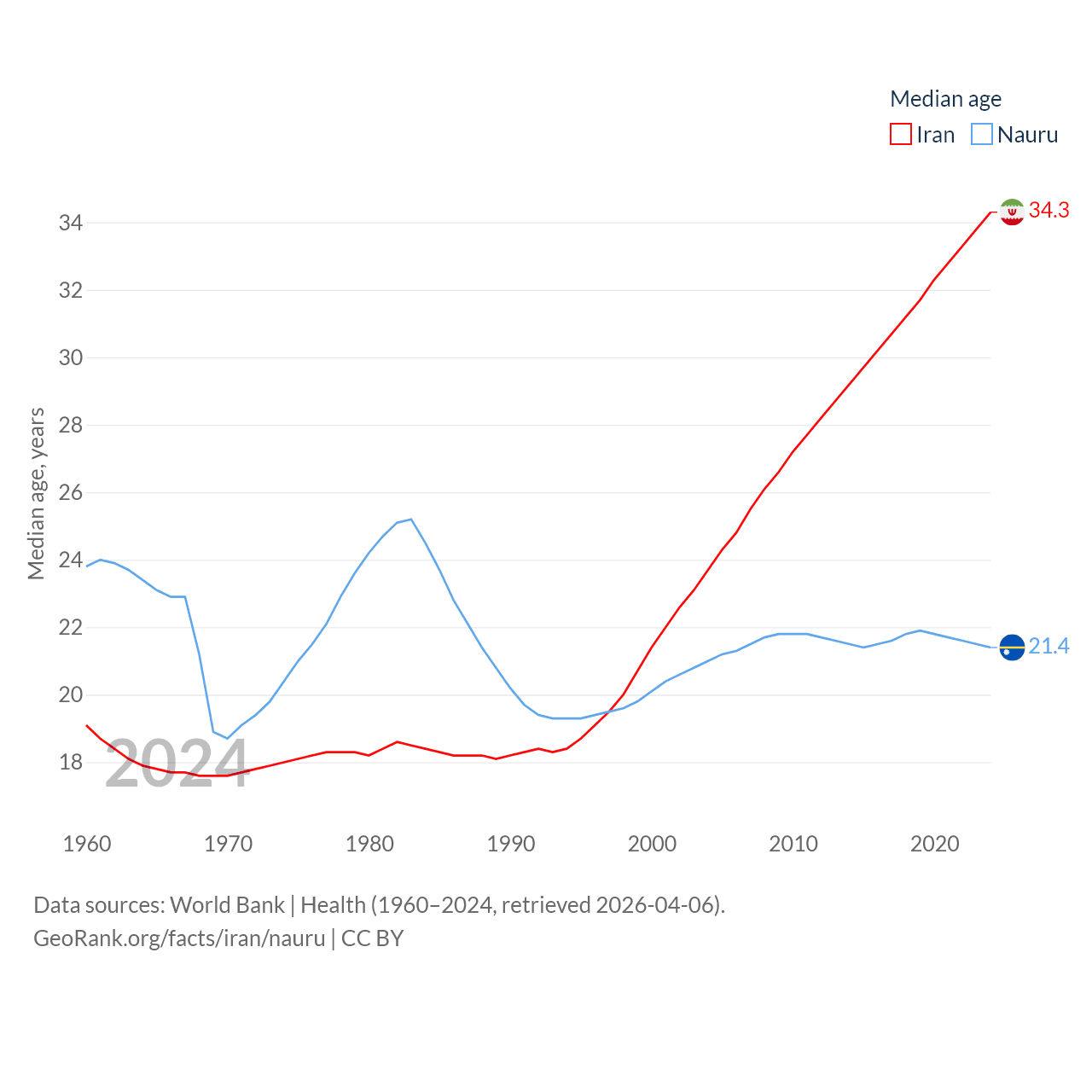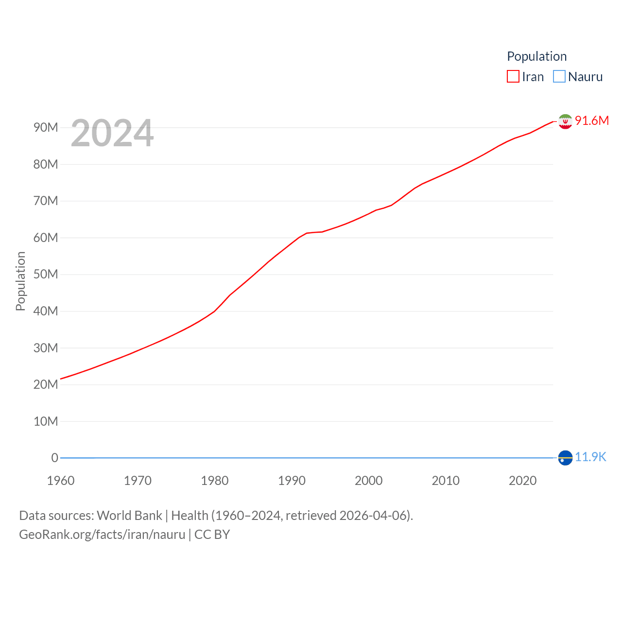 Iran has a population of 91.6M (ranked 17/197), compared with 11.9K in Nauru (ranked 195/197). Iran's land area is 626,451 sq mi versus 7.72 sq mi for Nauru (ranked 17th vs. 195th).
