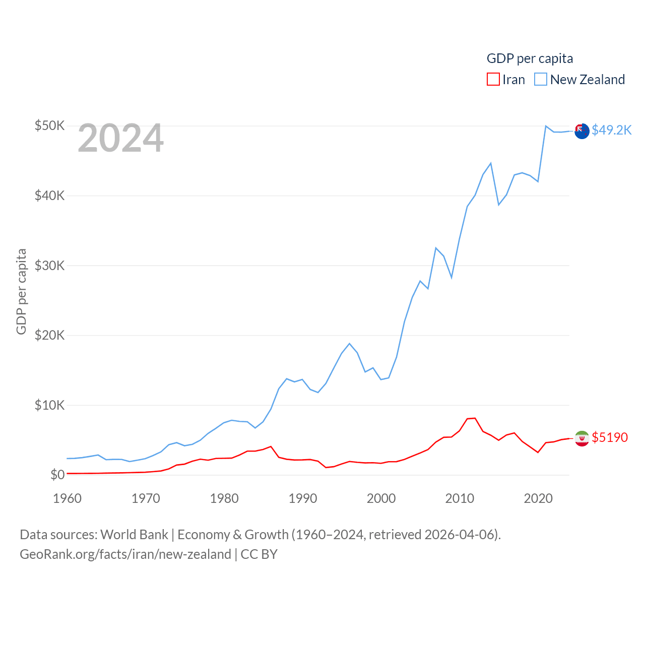 By GDP, Iran ranks 34/197 ($475B) and New Zealand ranks 52/197 ($260B). By GDP per capita, Iran ranks 119/197 ($5,190), while New Zealand ranks 26/197 ($49,205).