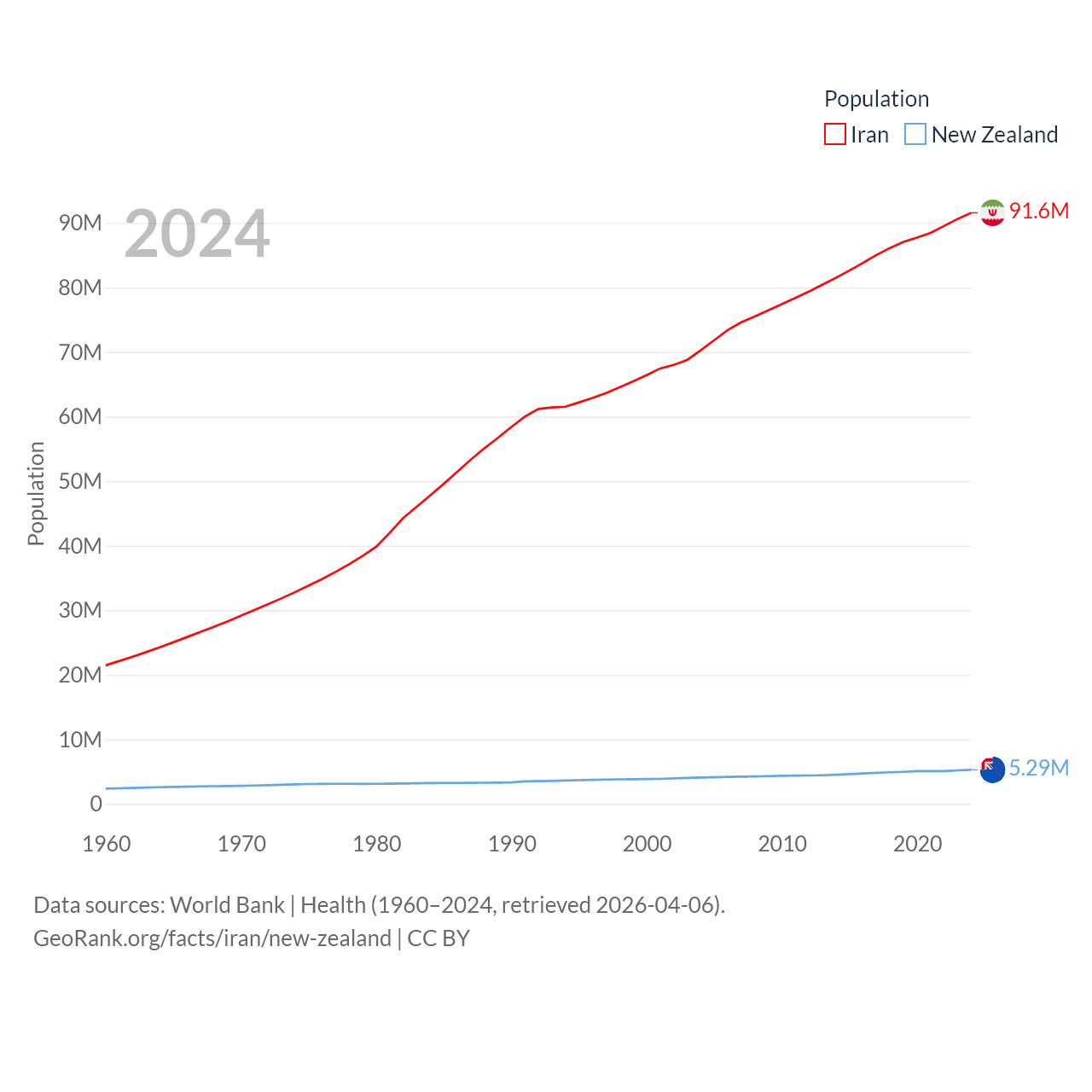 Iran has a population of 91.6M (ranked 17/197), compared with 5.29M in New Zealand (ranked 123/197). Iran's land area is 626,451 sq mi versus 101,665 sq mi for New Zealand (ranked 17th vs. 74th).