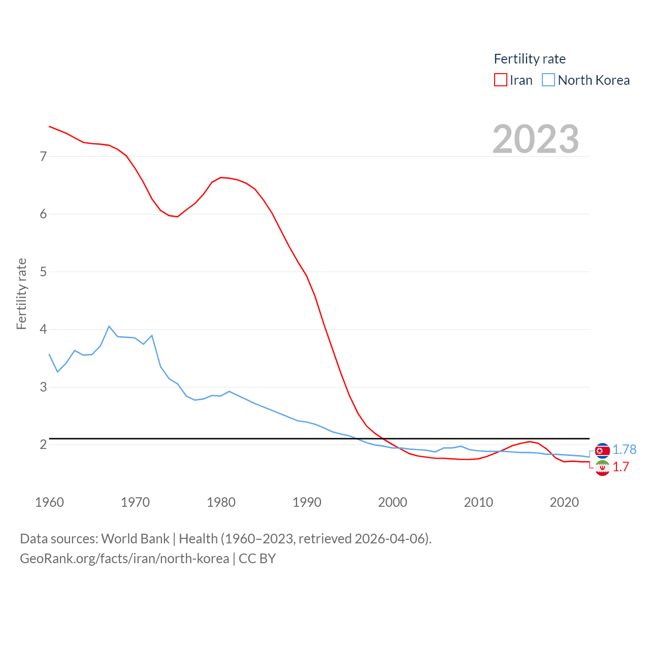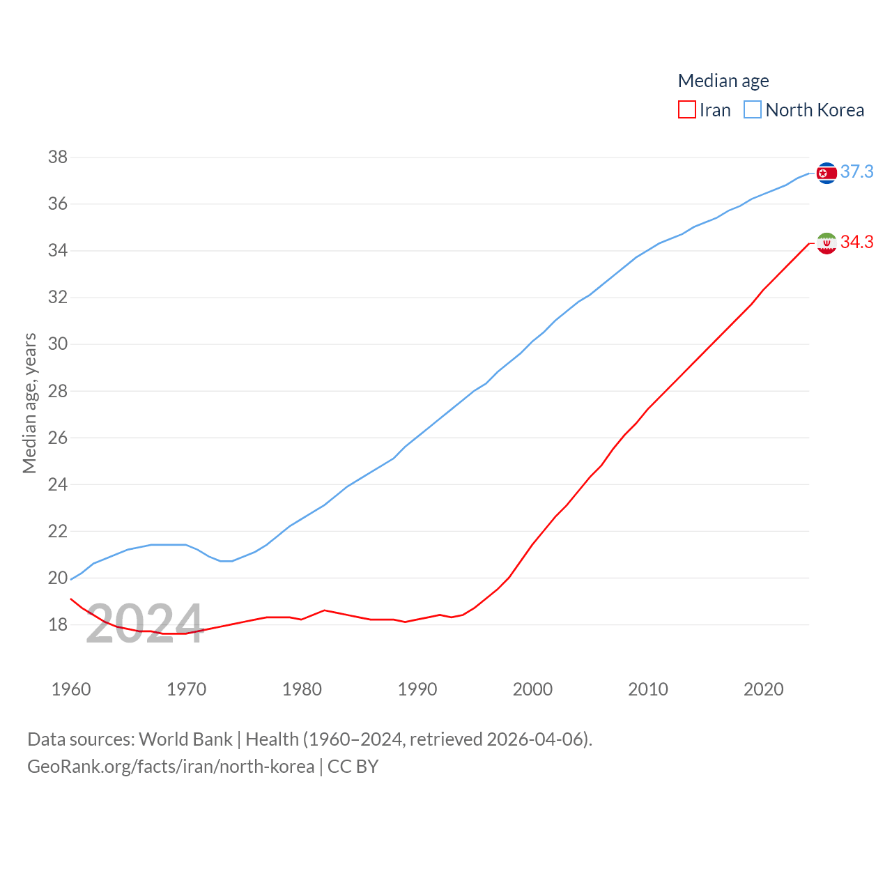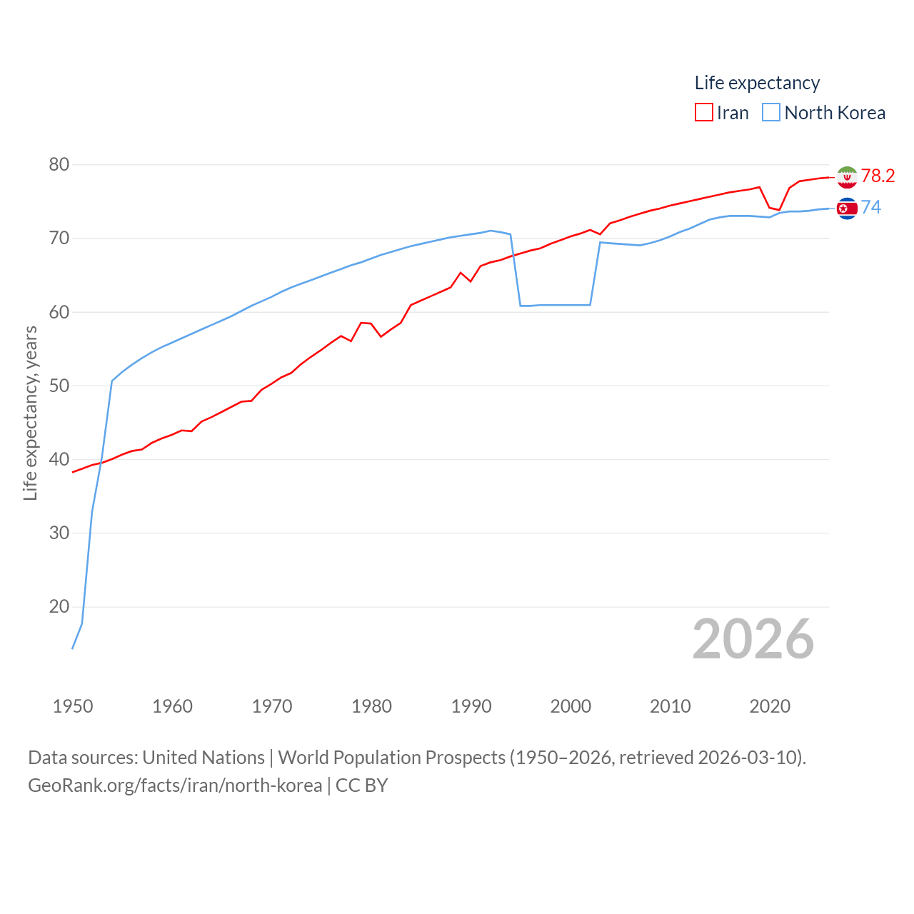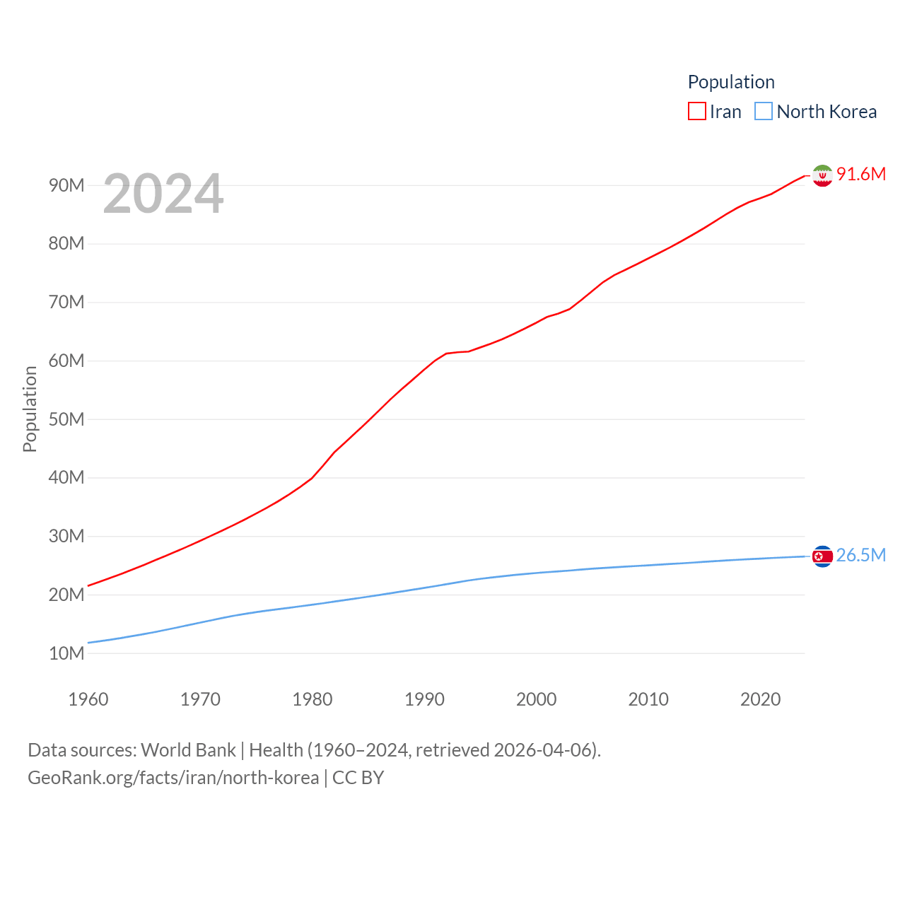 Iran has a population of 91.6M (ranked 17/197), compared with 26.5M in North Korea (ranked 56/197). Iran's land area is 626,451 sq mi versus 46,491 sq mi for North Korea (ranked 17th vs. 97th).