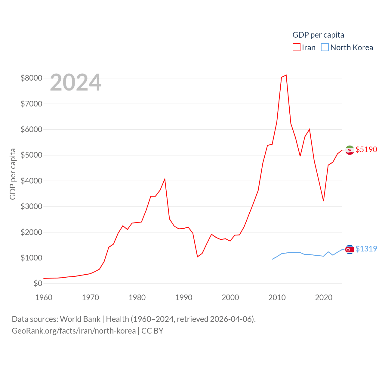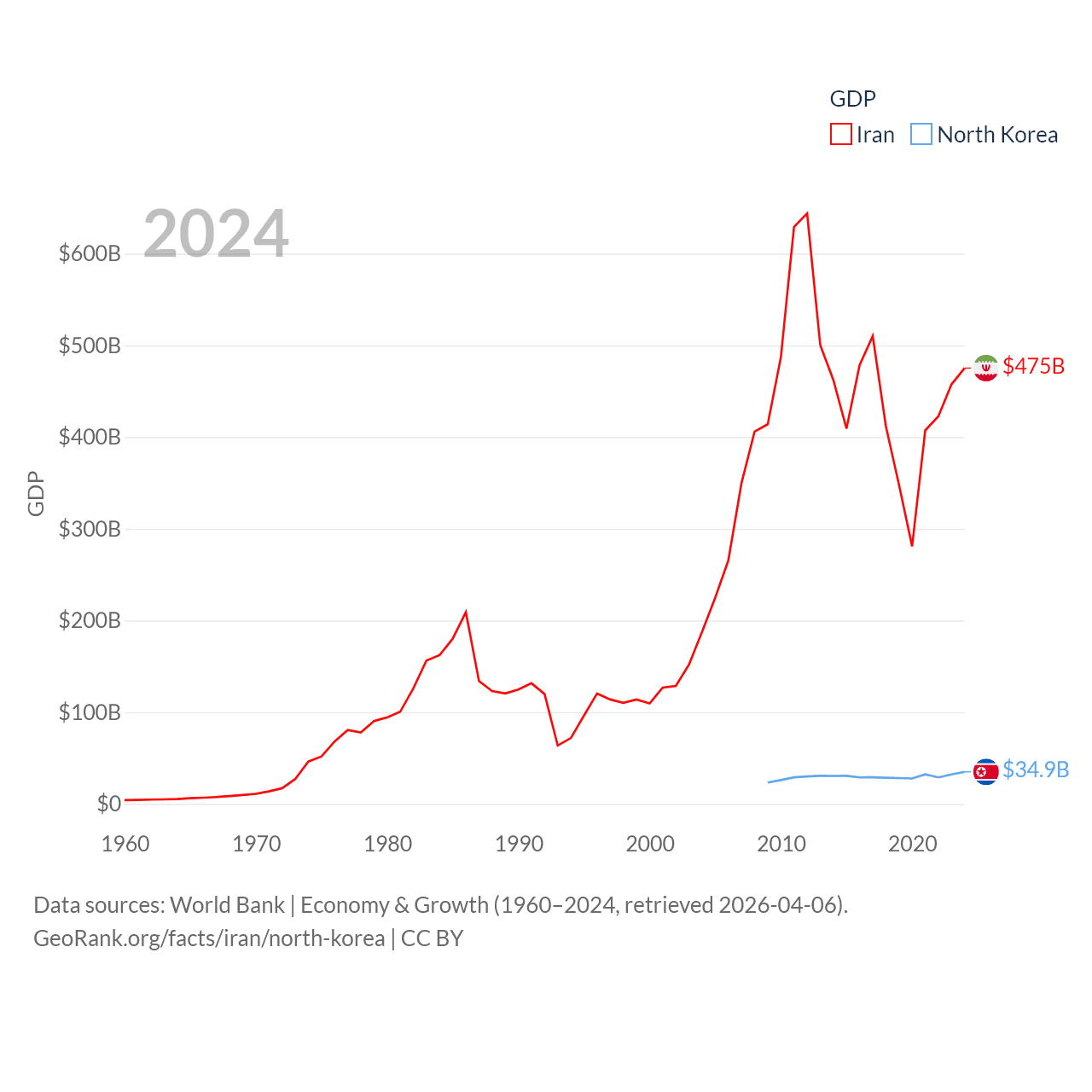 By GDP, Iran ranks 34/197 ($475B) and North Korea ranks 106/197 ($34.9B). By GDP per capita, Iran ranks 119/197 ($5,190), while North Korea ranks 168/197 ($1,319).