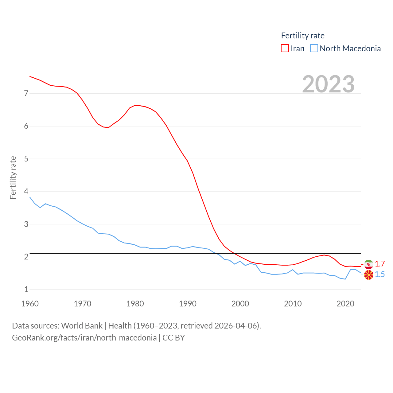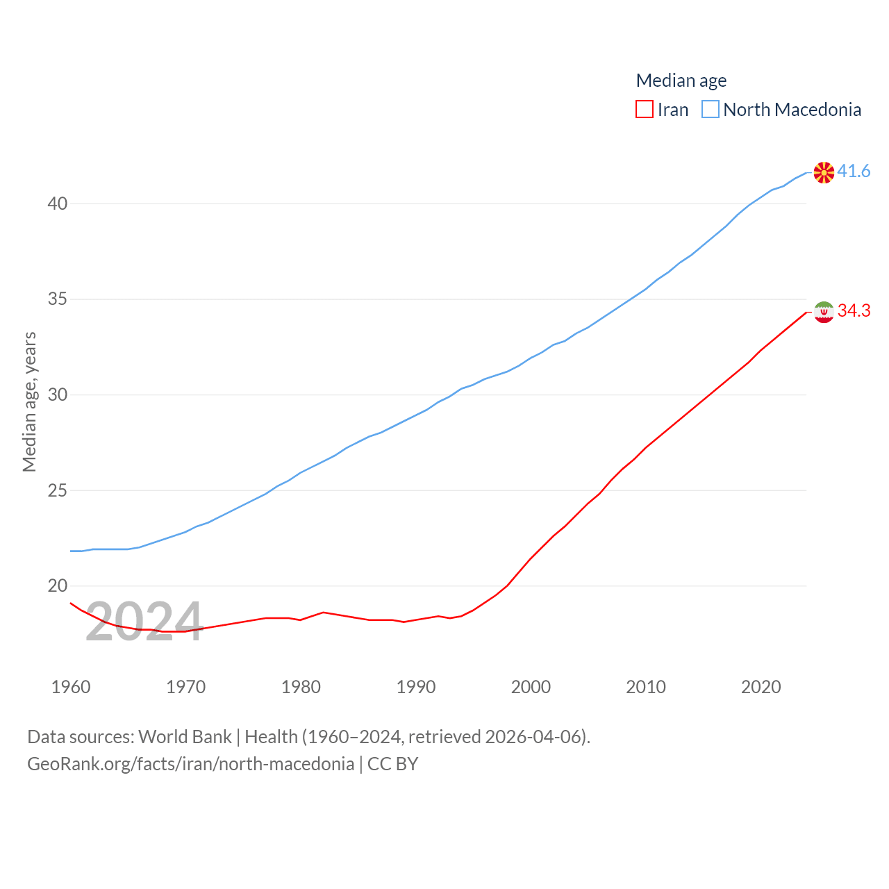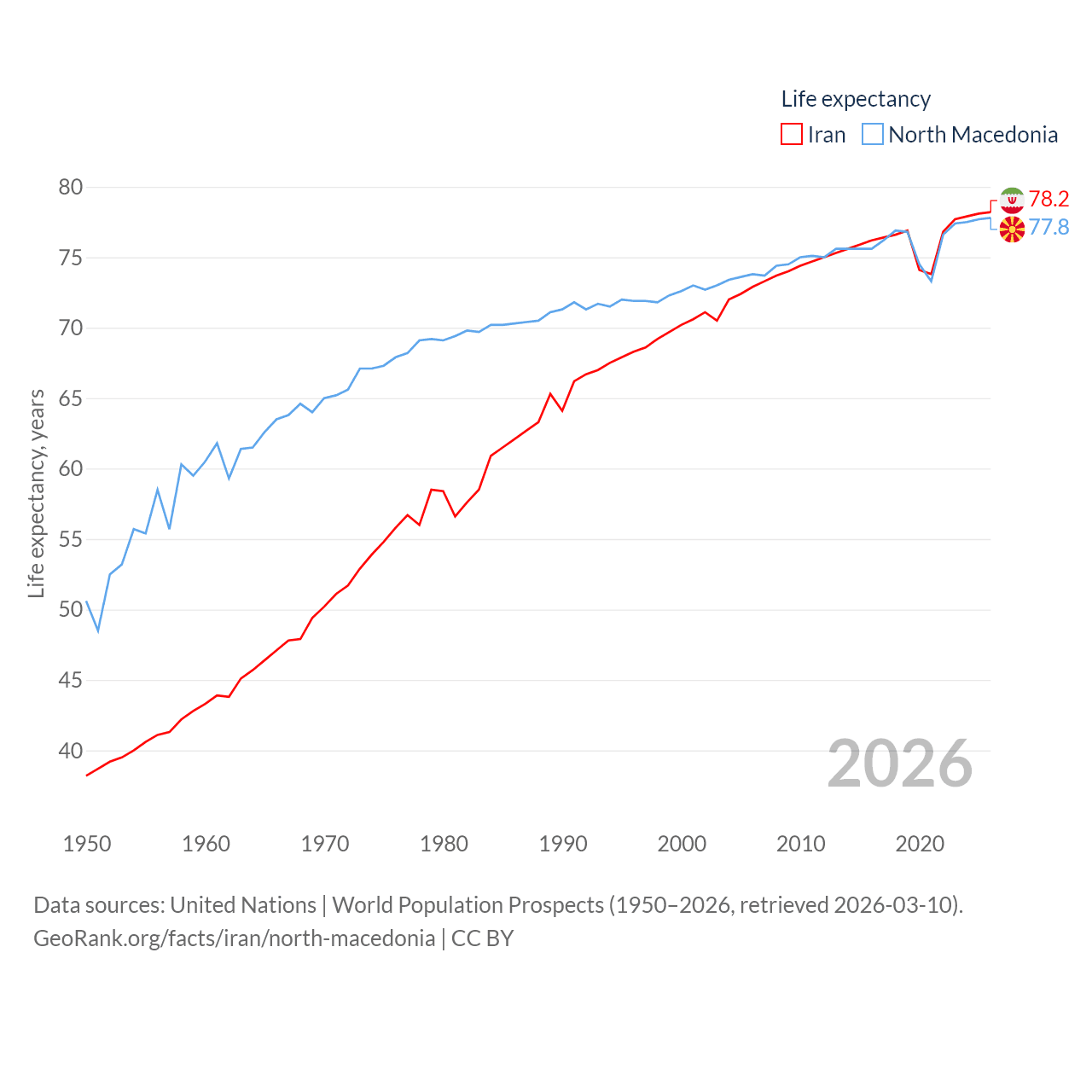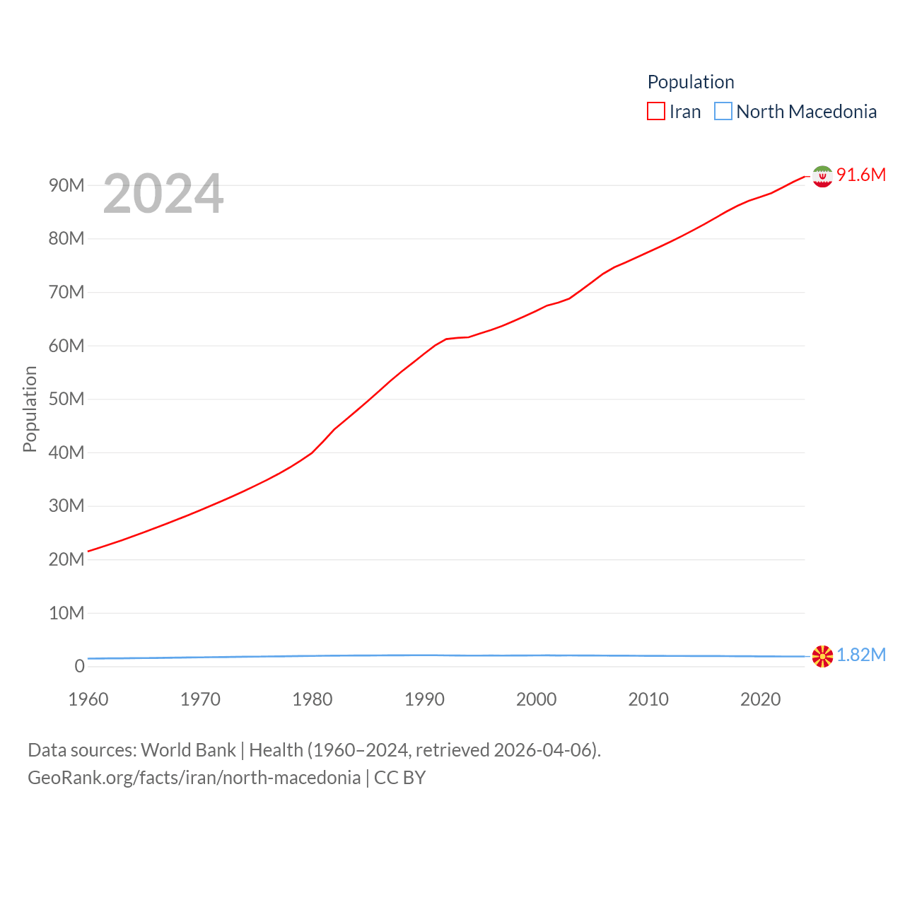 Iran has a population of 91.6M (ranked 17/197), compared with 1.82M in North Macedonia (ranked 150/197). Iran's land area is 626,451 sq mi versus 9,737 sq mi for North Macedonia (ranked 17th vs. 145th).