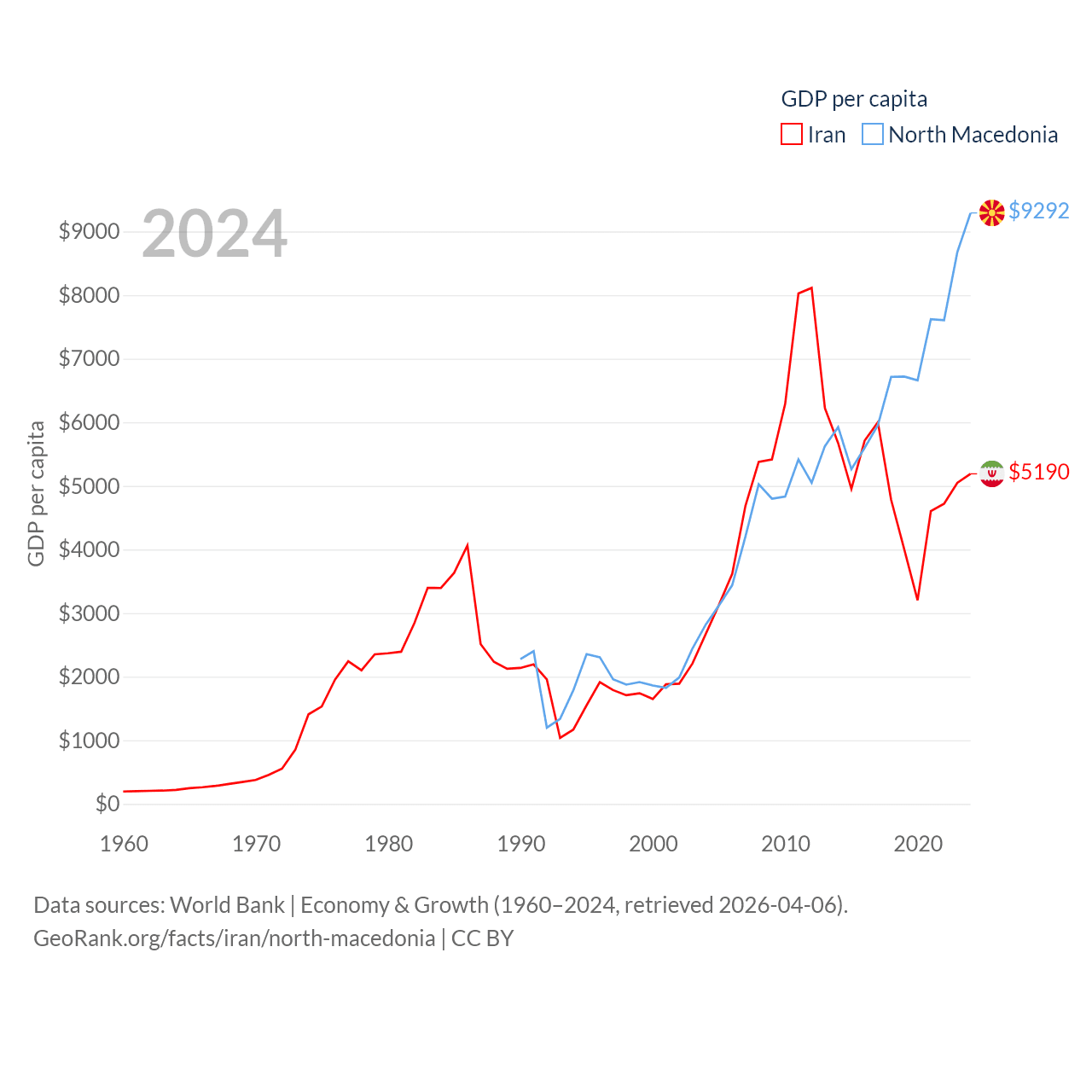 By GDP, Iran ranks 34/197 ($475B) and North Macedonia ranks 138/197 ($17B). By GDP per capita, Iran ranks 119/197 ($5,190), while North Macedonia ranks 88/197 ($9,292).