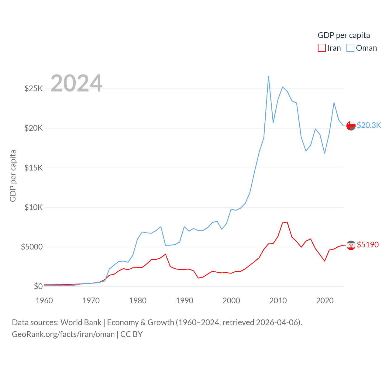 By GDP, Iran ranks 34/197 ($475B) and Oman ranks 70/197 ($107B). By GDP per capita, Iran ranks 119/197 ($5,190), while Oman ranks 57/197 ($20,285).