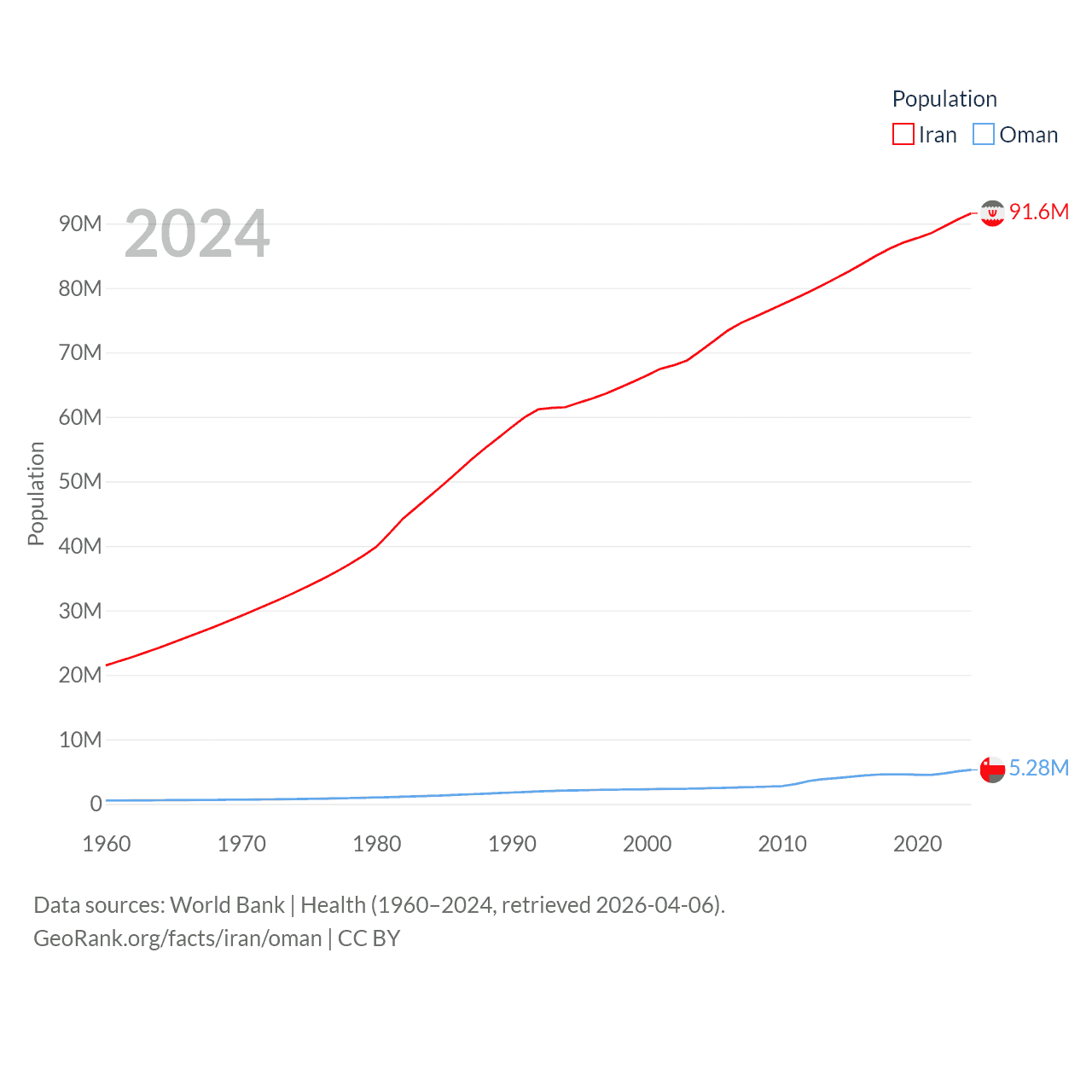 Iran has a population of 91.6M (ranked 17/197), compared with 5.28M in Oman (ranked 124/197). Iran's land area is 626,451 sq mi versus 119,499 sq mi for Oman (ranked 17th vs. 68th).