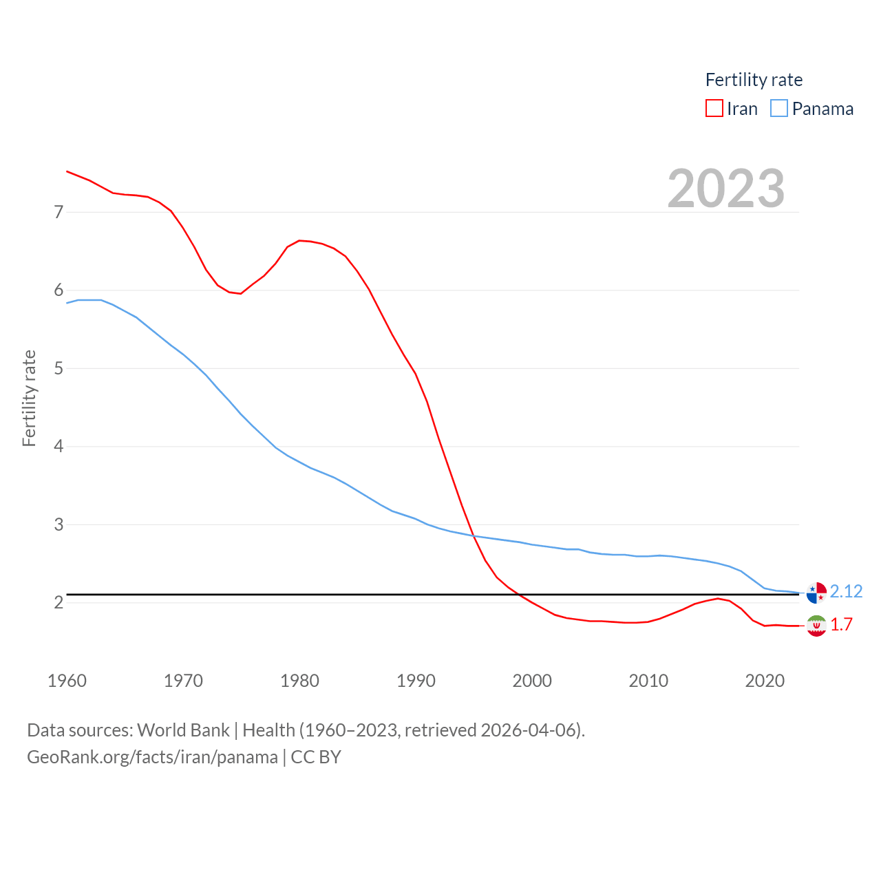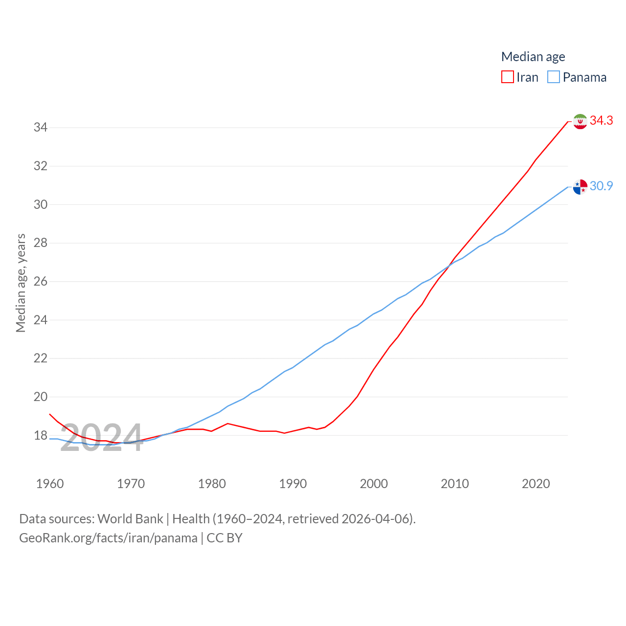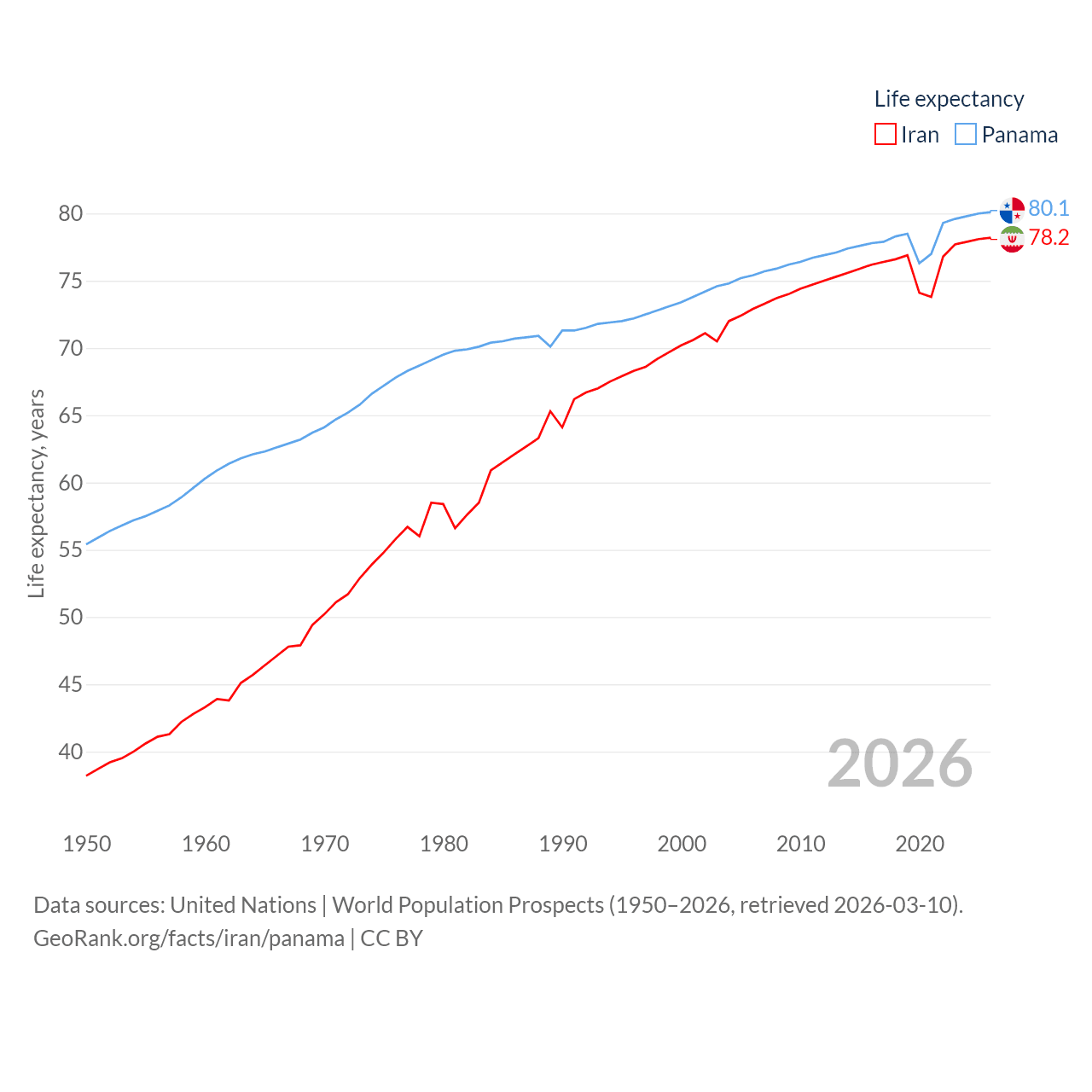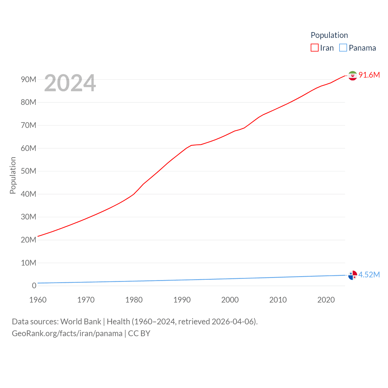 Iran has a population of 91.6M (ranked 17/197), compared with 4.52M in Panama (ranked 128/197). Iran's land area is 626,451 sq mi versus 28,641 sq mi for Panama (ranked 17th vs. 115th).