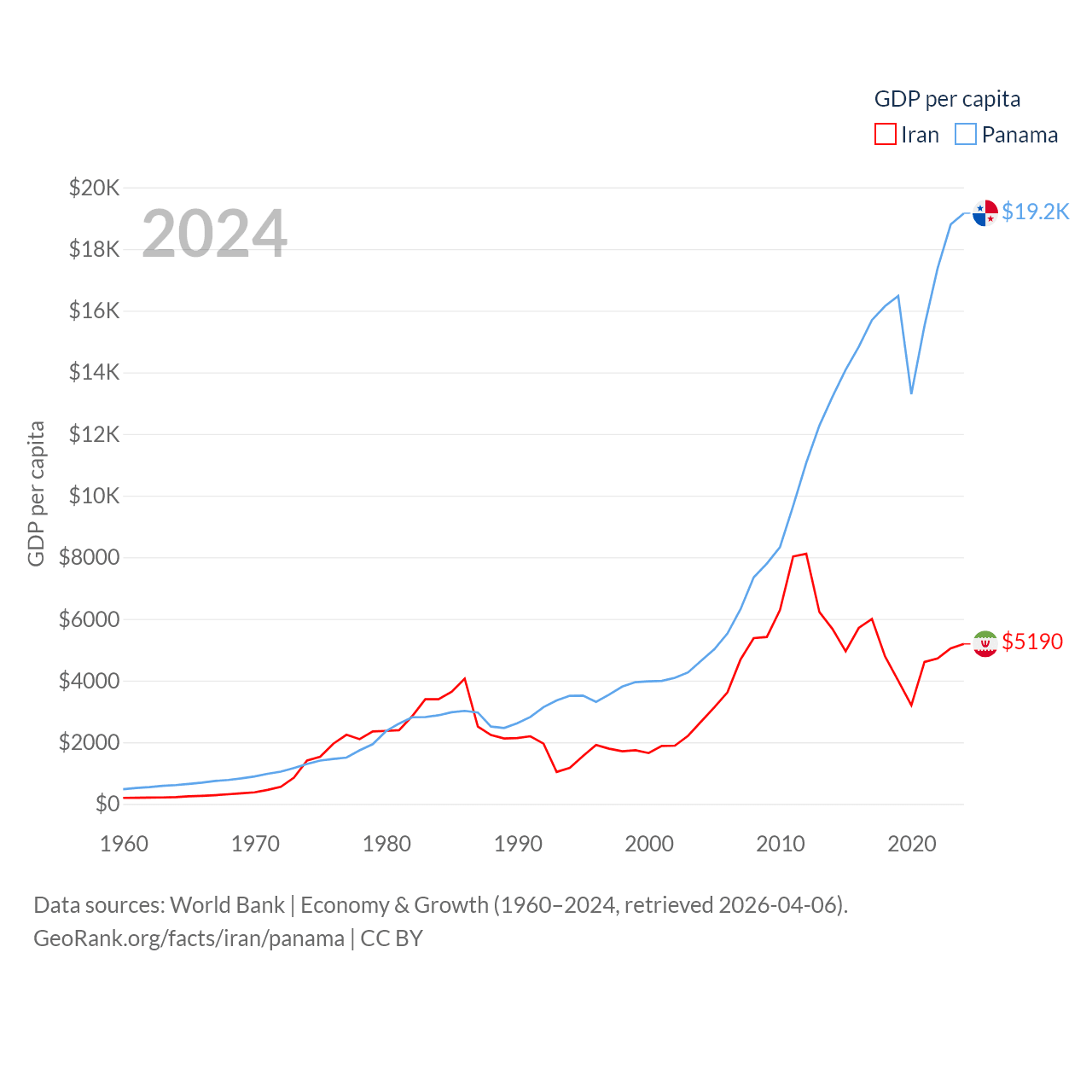 By GDP, Iran ranks 34/197 ($475B) and Panama ranks 78/197 ($86.5B). By GDP per capita, Iran ranks 119/197 ($5,190), while Panama ranks 60/197 ($19,161).