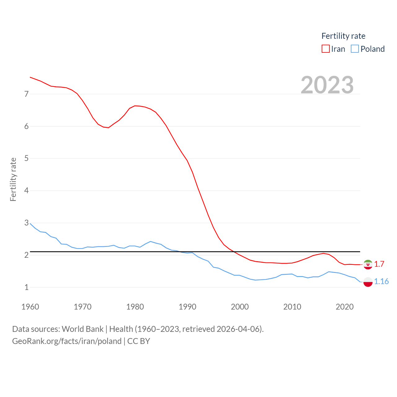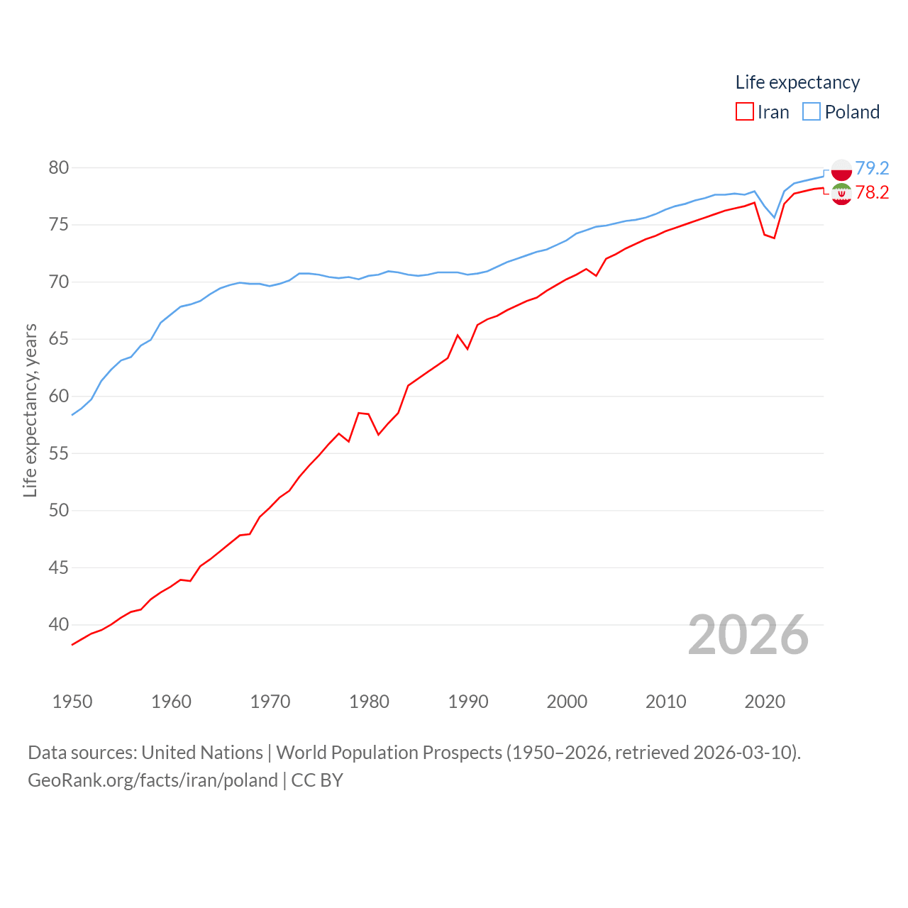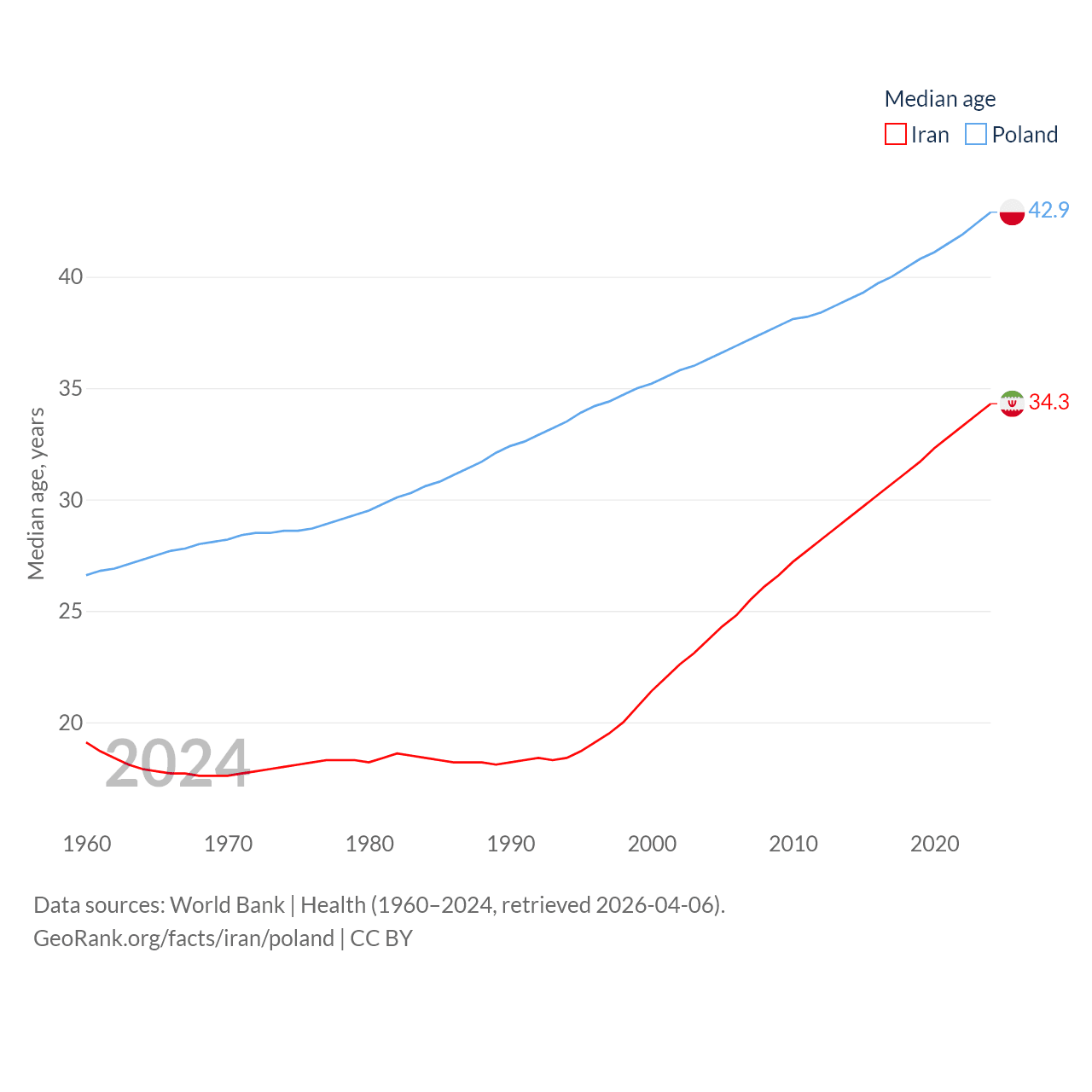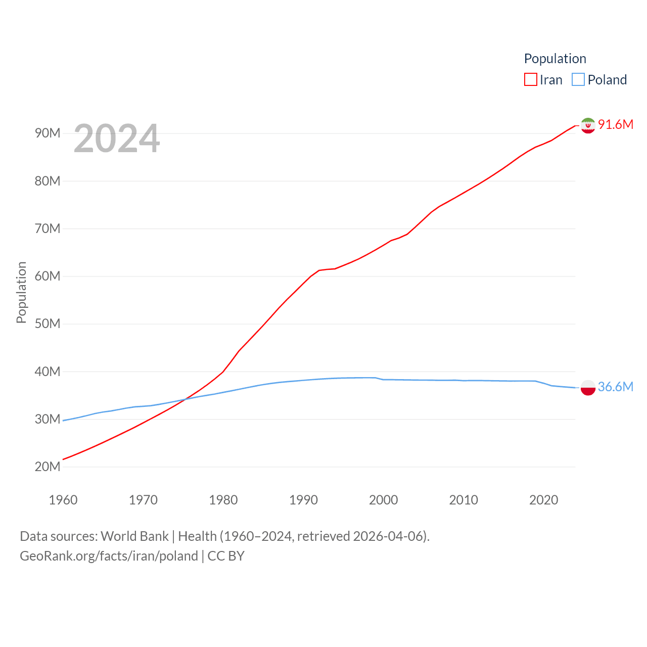 Iran has a population of 91.6M (ranked 17/197), compared with 36.6M in Poland (ranked 42/197). Iran's land area is 626,451 sq mi versus 118,252 sq mi for Poland (ranked 17th vs. 69th).